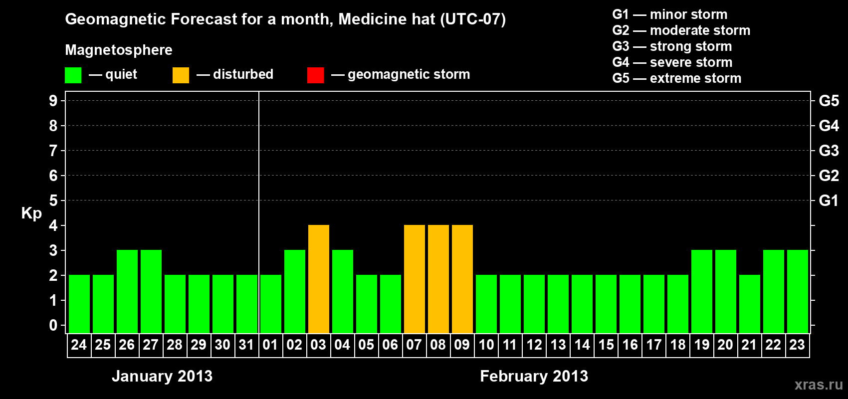 Geomagnetic storm forecast in Medicine hat for Jan 24, 2013