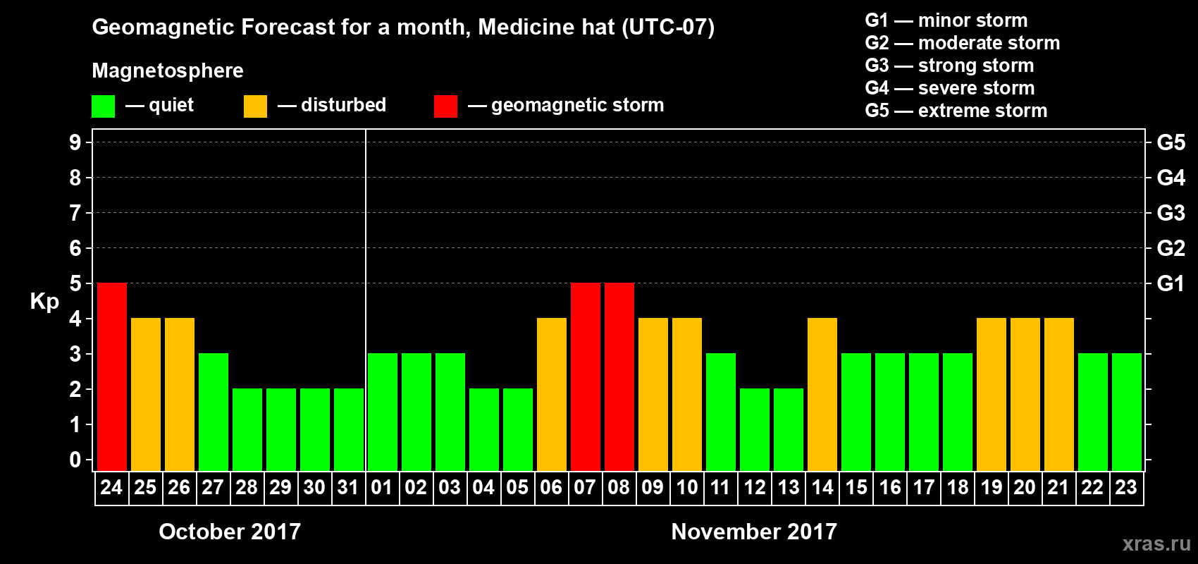 Geomagnetic storm forecast in Medicine hat for Oct 24, 2017