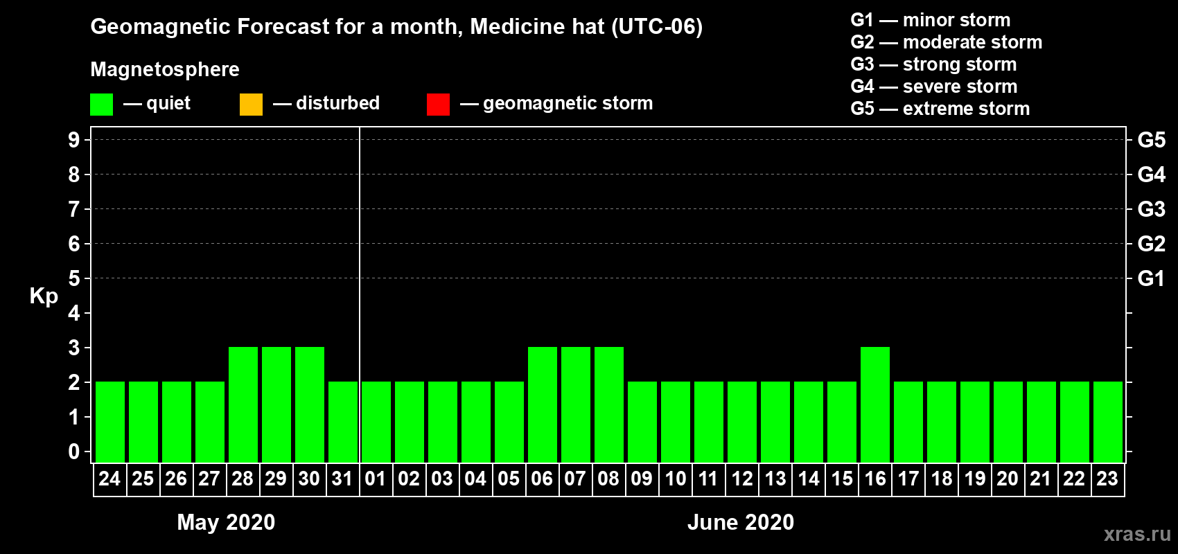 Geomagnetic storm forecast in Medicine hat for May 24, 2020
