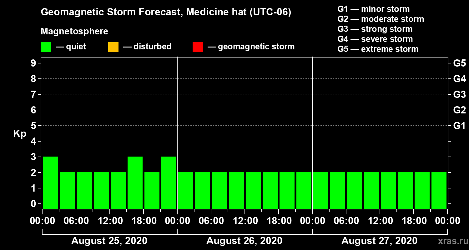 Geomagnetic storm forecast in Medicine hat for Aug 25, 2020