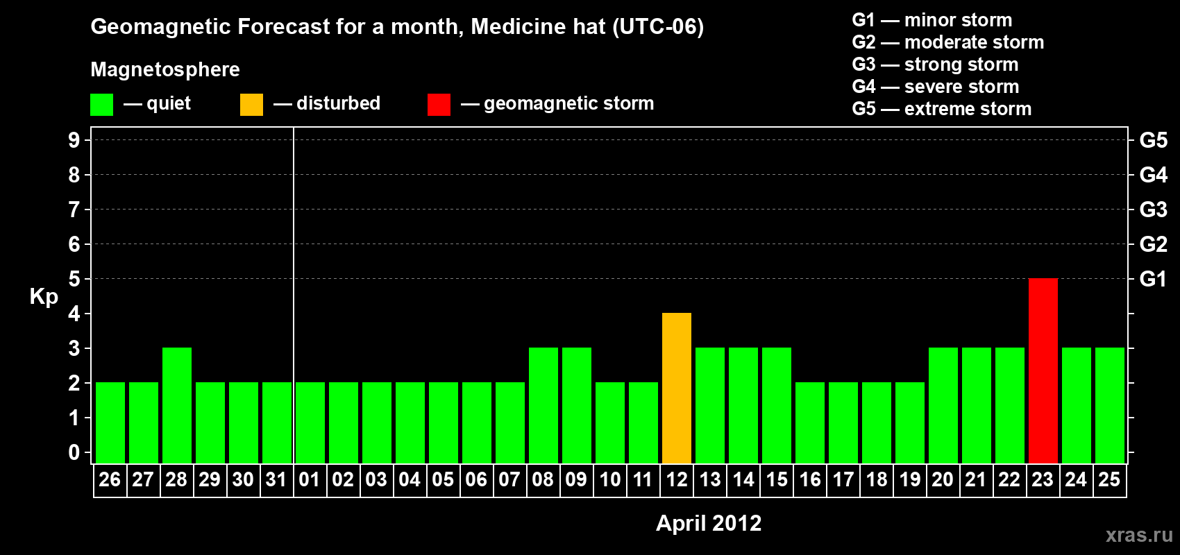 Geomagnetic storm forecast in Medicine hat for Mar 26, 2012