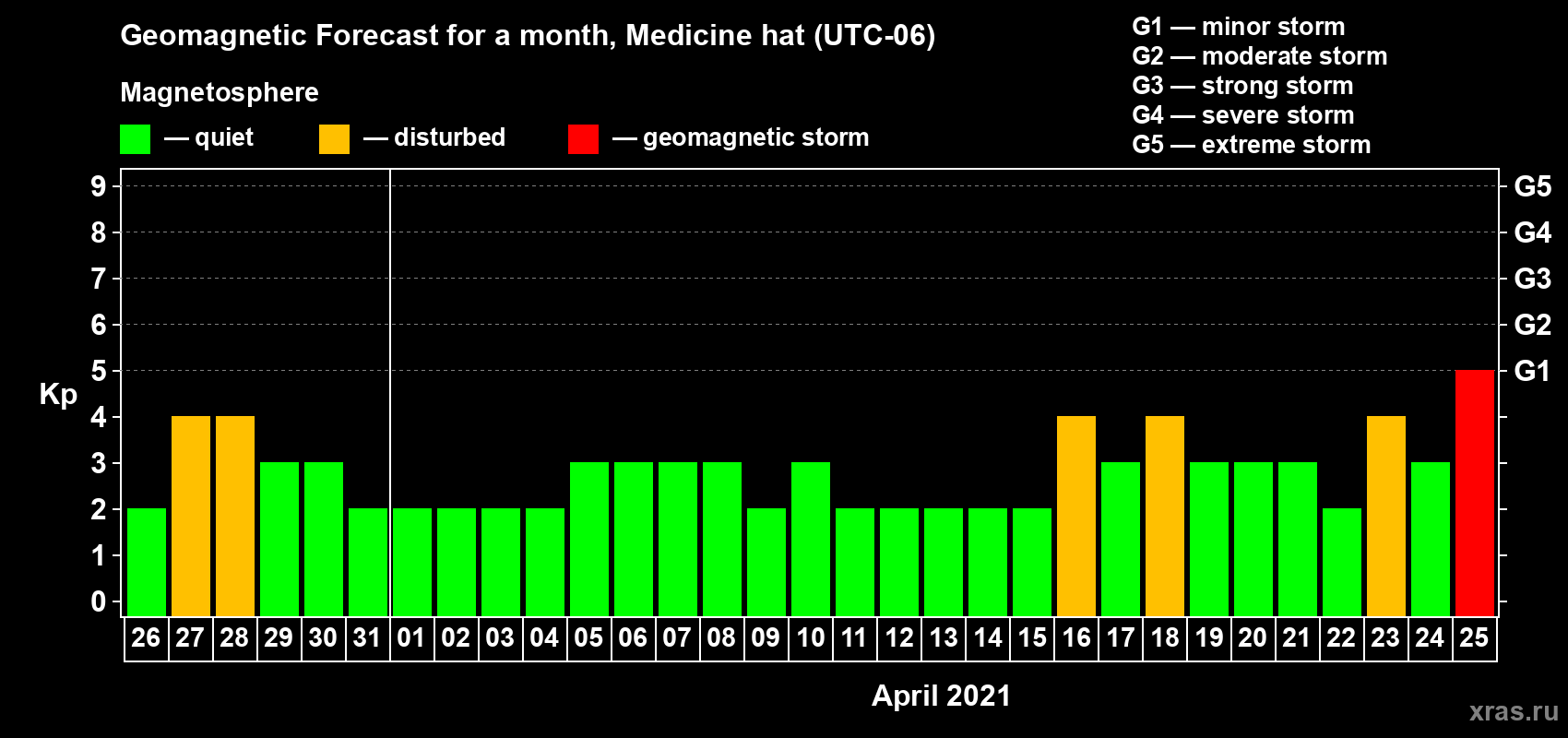 Geomagnetic storm forecast in Medicine hat for Mar 26, 2021