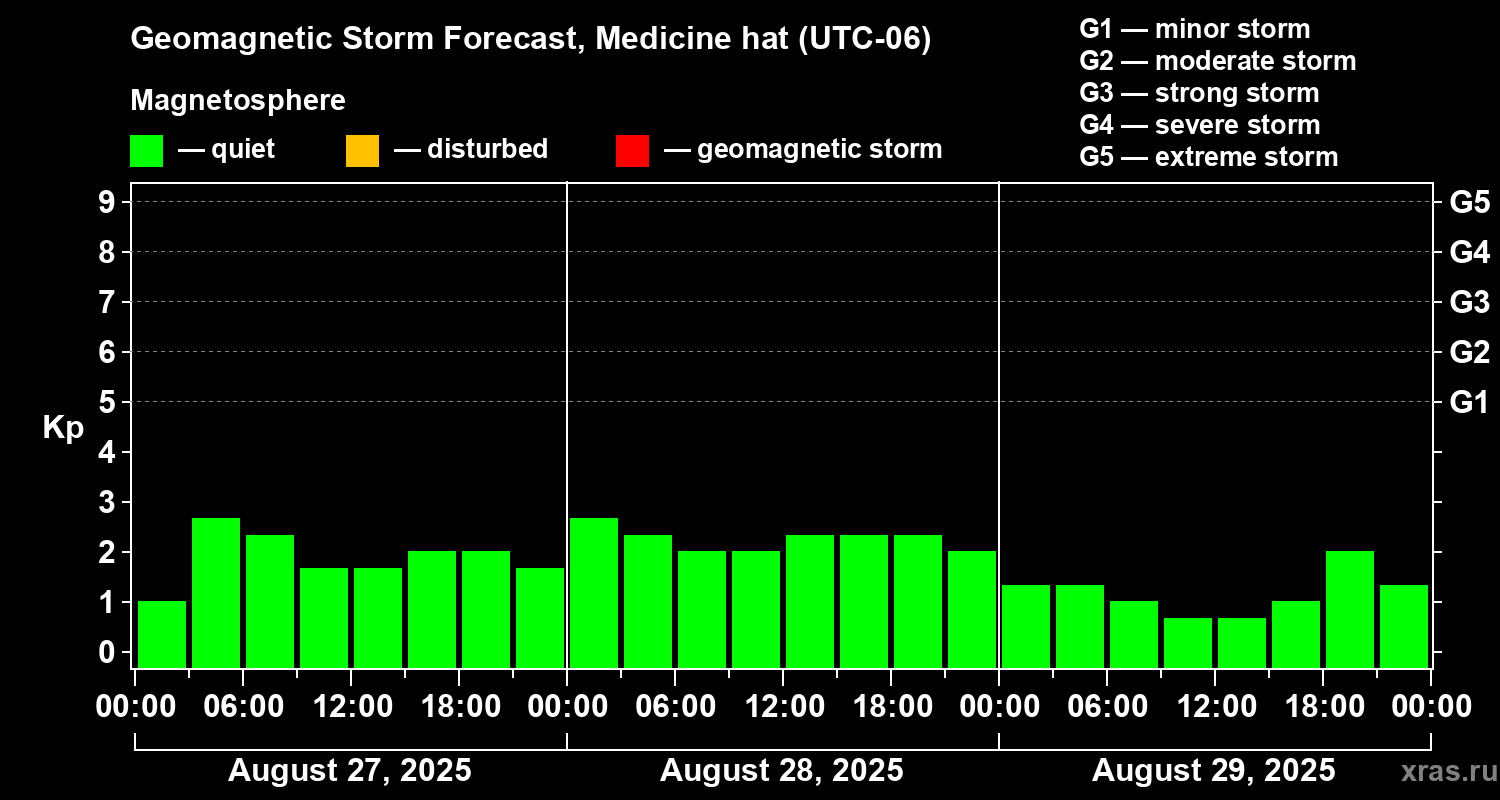 Geomagnetic storm forecast in Medicine hat for Aug 27, 2025