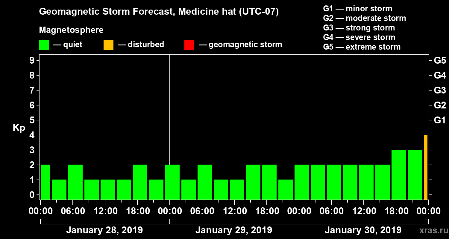 Geomagnetic storm forecast in Medicine hat for Jan 28, 2019