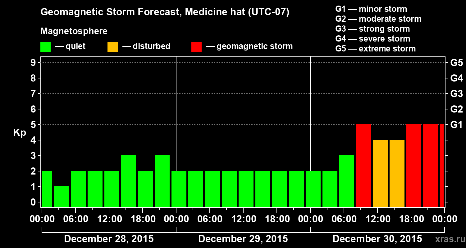 Geomagnetic storm forecast in Medicine hat for Dec 28, 2015