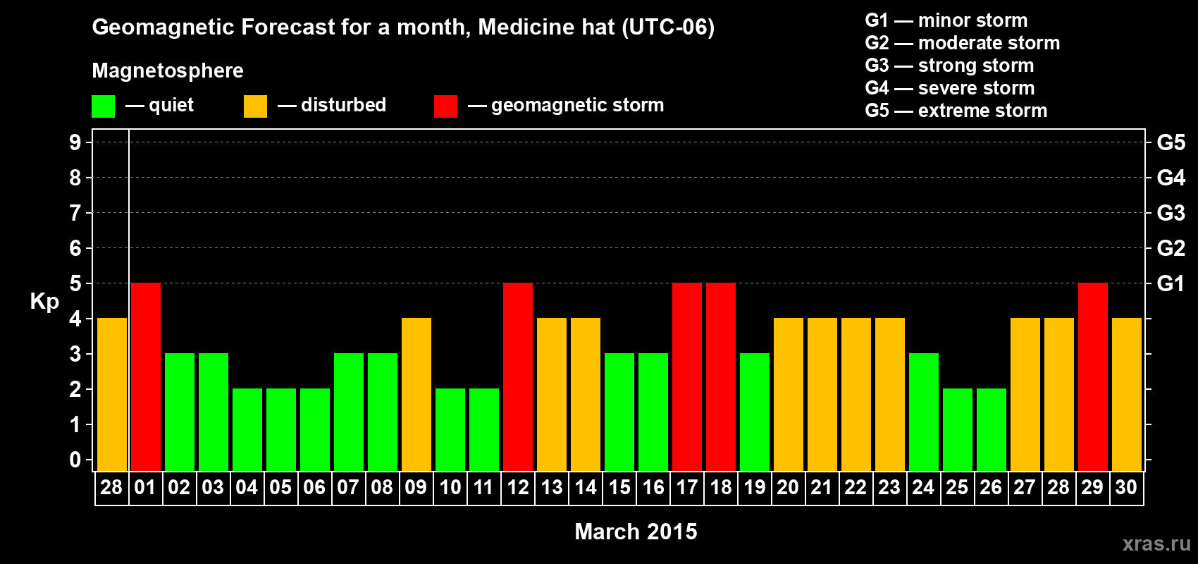 Geomagnetic storm forecast in Medicine hat for Feb 28, 2015