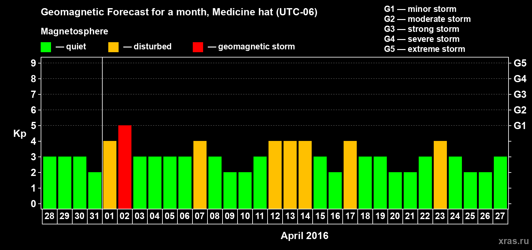 Geomagnetic storm forecast in Medicine hat for Mar 28, 2016