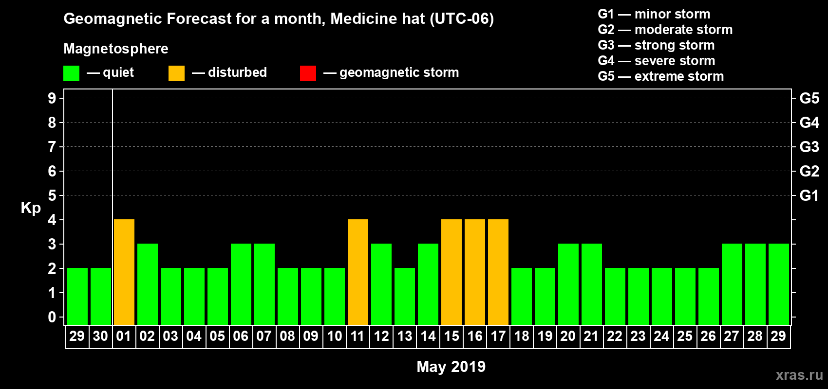 Geomagnetic storm forecast in Medicine hat for Apr 29, 2019
