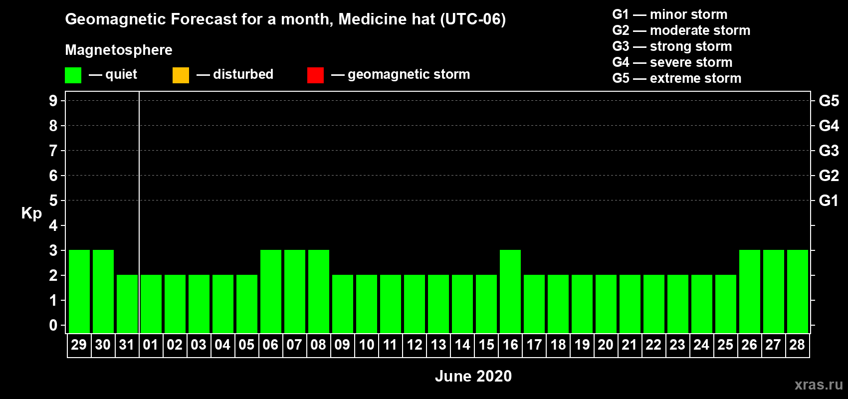 Geomagnetic storm forecast in Medicine hat for May 29, 2020