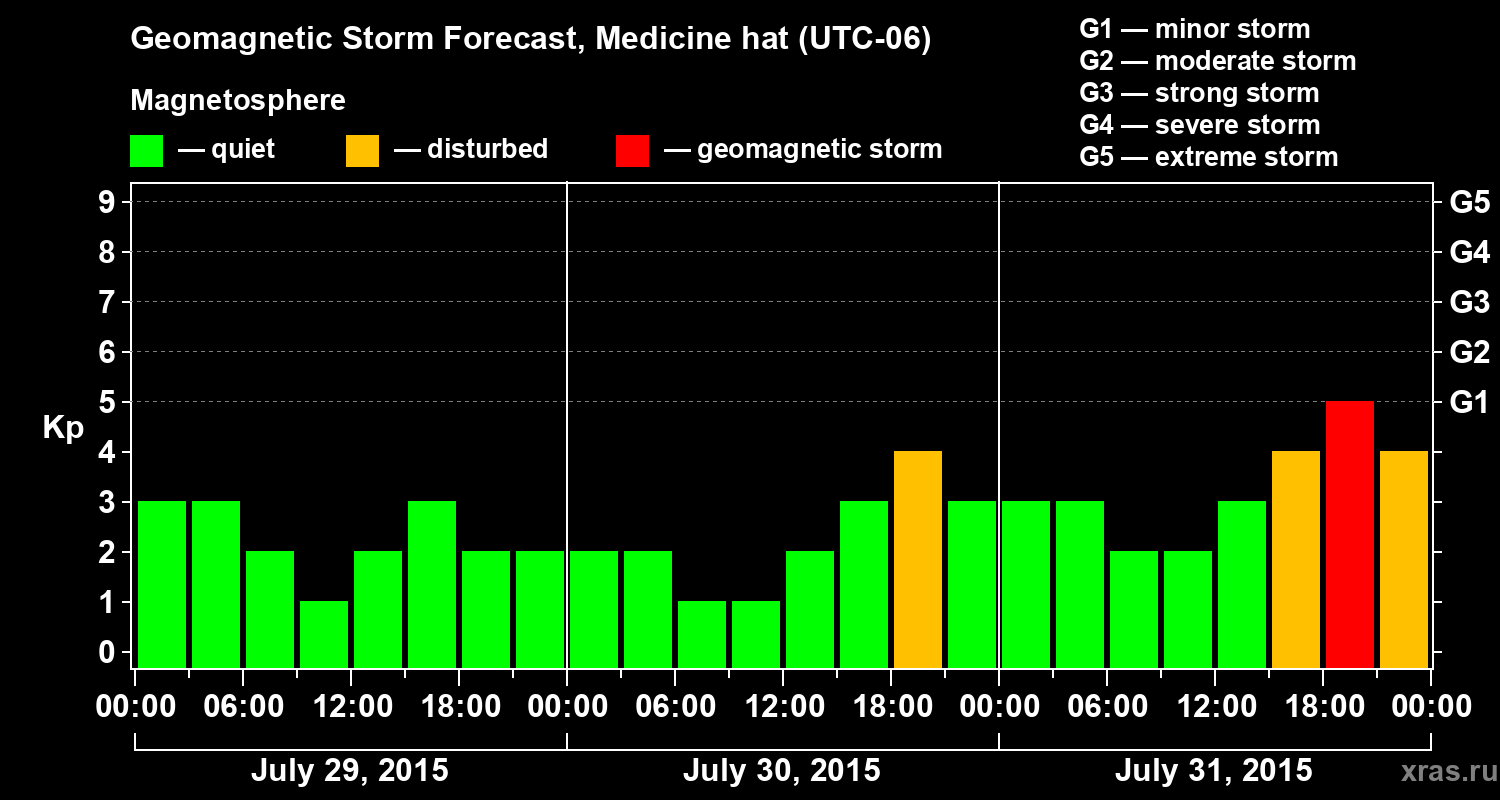 Geomagnetic storm forecast in Medicine hat for Jul 29, 2015