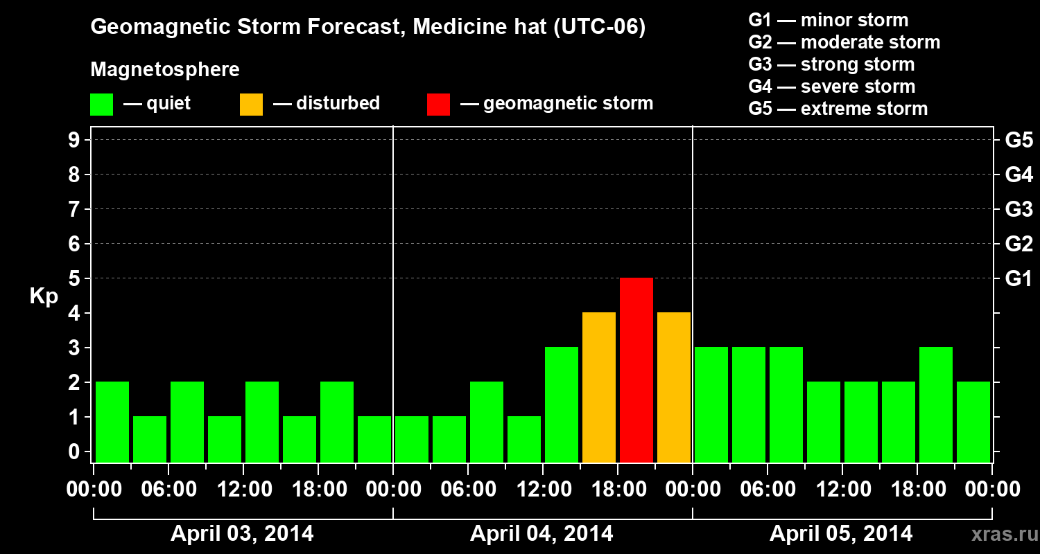 Geomagnetic storm forecast in Medicine hat for Apr 03, 2014