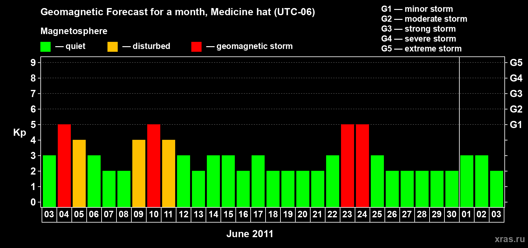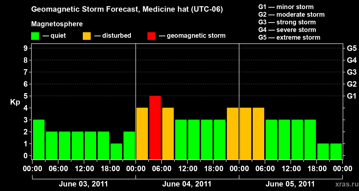 Geomagnetic storm forecast in Medicine hat for Jun 03, 2011