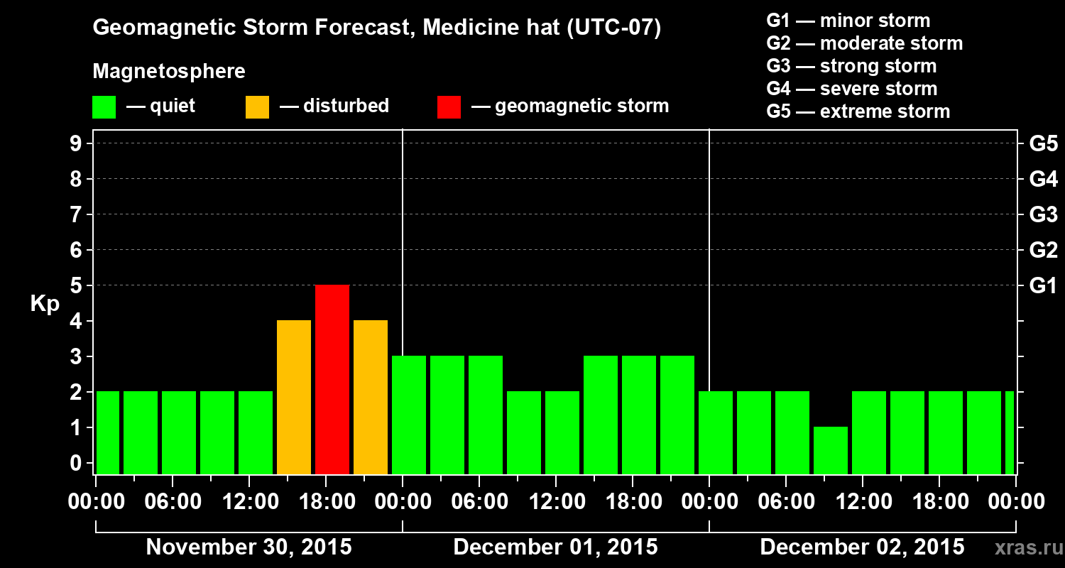 Geomagnetic storm forecast in Medicine hat for Nov 30, 2015