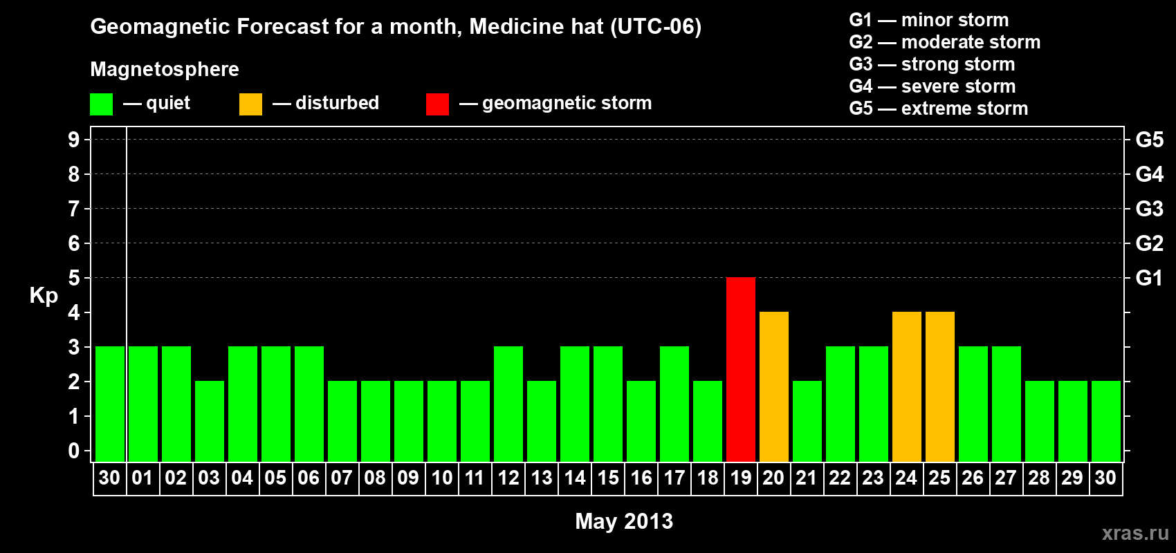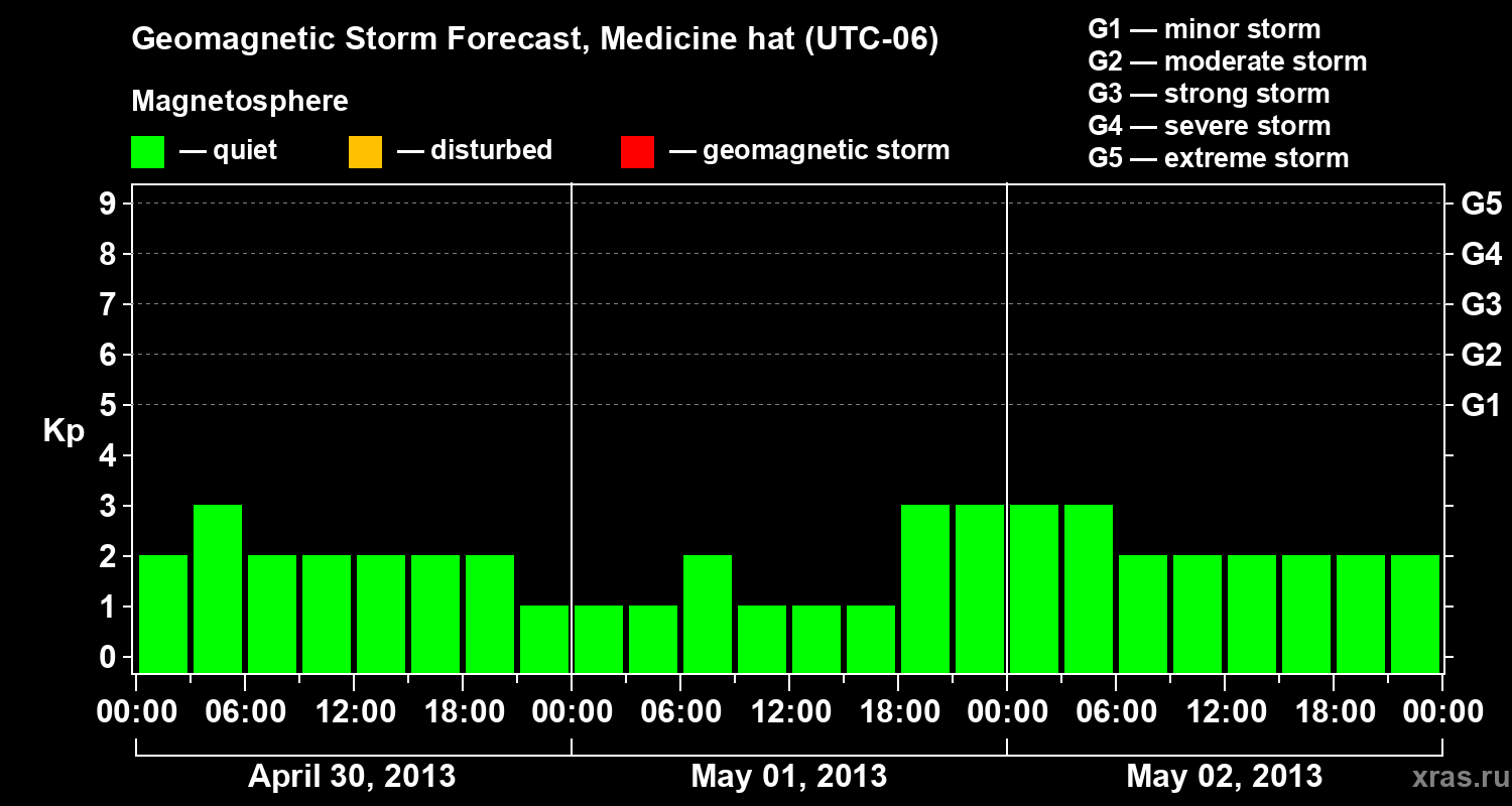 Geomagnetic storm forecast in Medicine hat for Apr 30, 2013