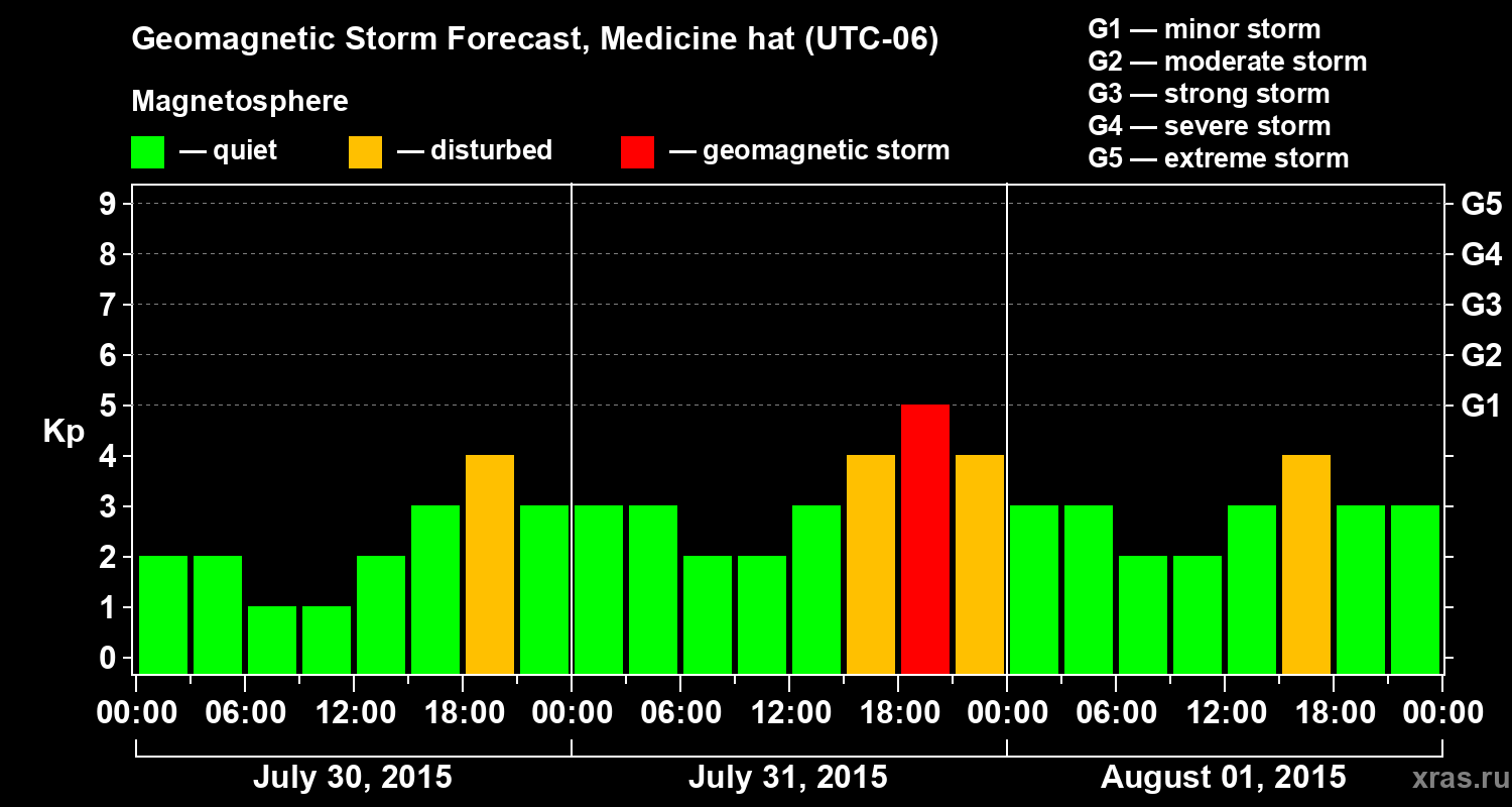 Geomagnetic storm forecast in Medicine hat for Jul 30, 2015