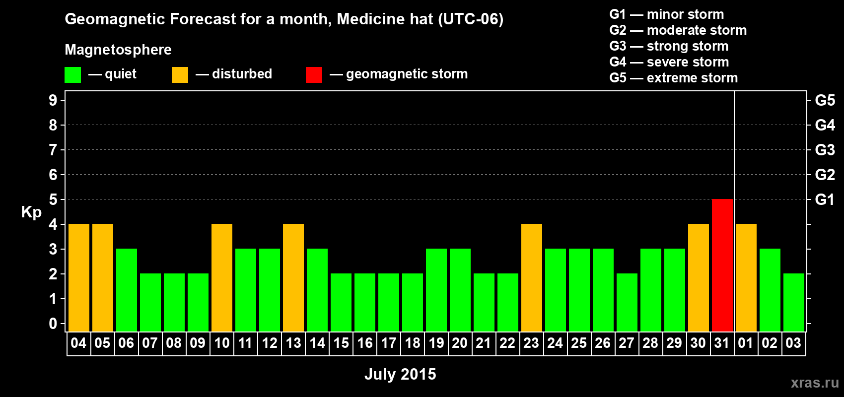 Geomagnetic storm forecast in Medicine hat for Jul 04, 2015