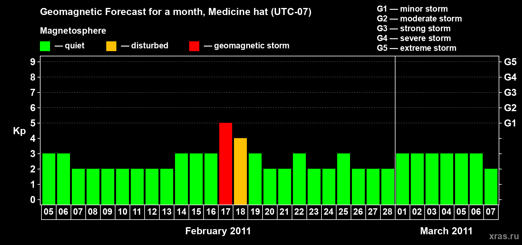Geomagnetic storm forecast in Medicine hat for Feb 05, 2011