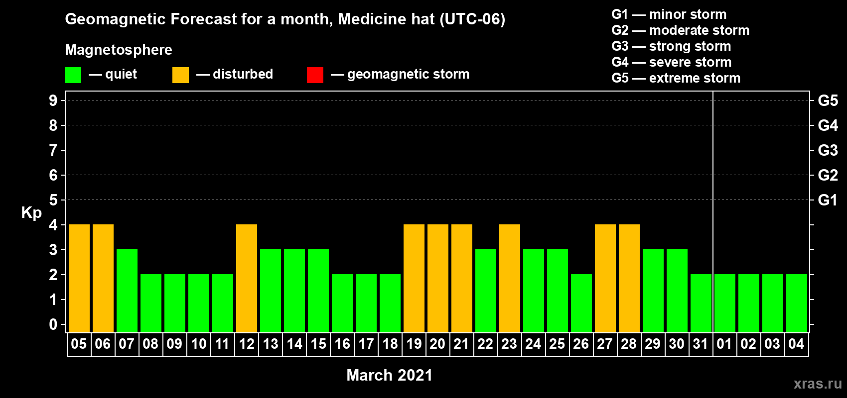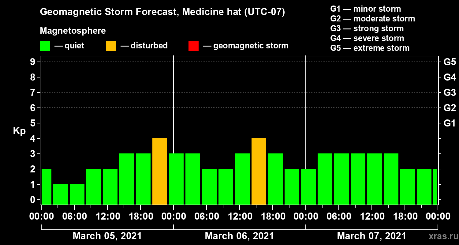 Geomagnetic storm forecast in Medicine hat for Mar 05, 2021