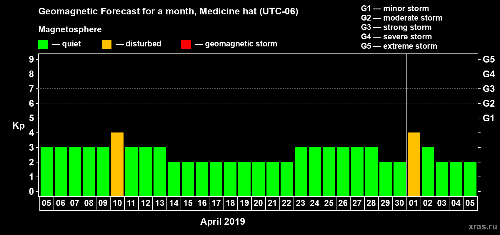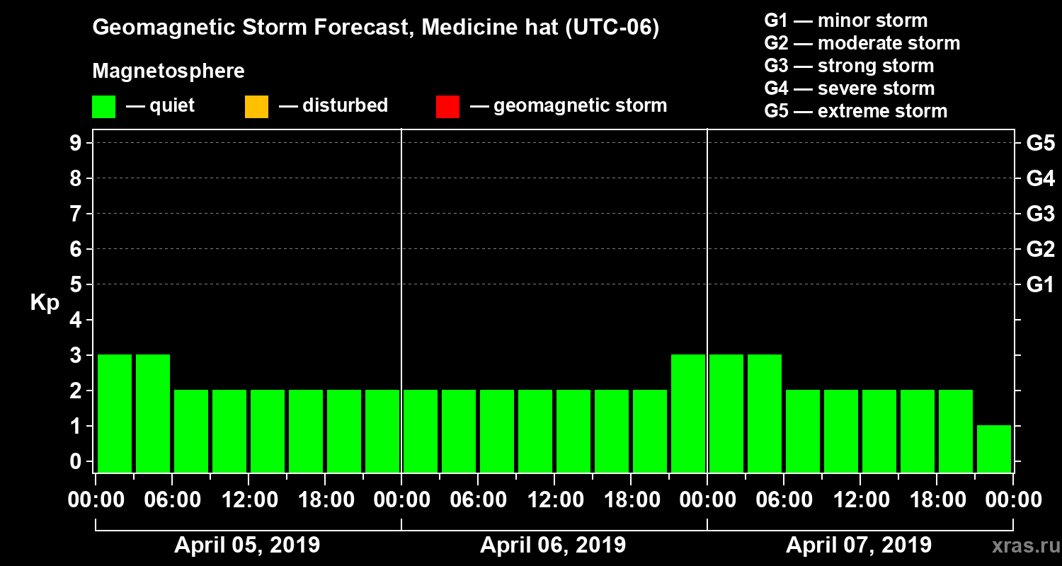 Geomagnetic storm forecast in Medicine hat for Apr 05, 2019