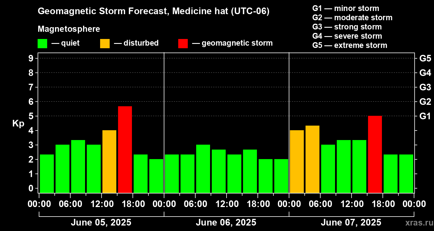 Geomagnetic storm forecast in Medicine hat for Jun 05, 2025