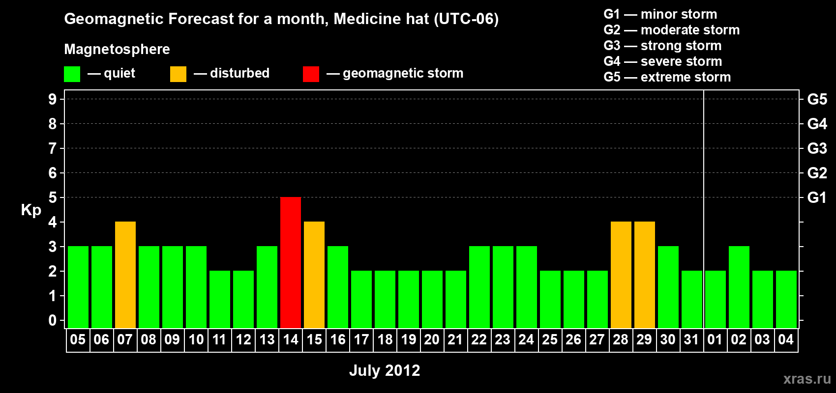 Geomagnetic storm forecast in Medicine hat for Jul 05, 2012