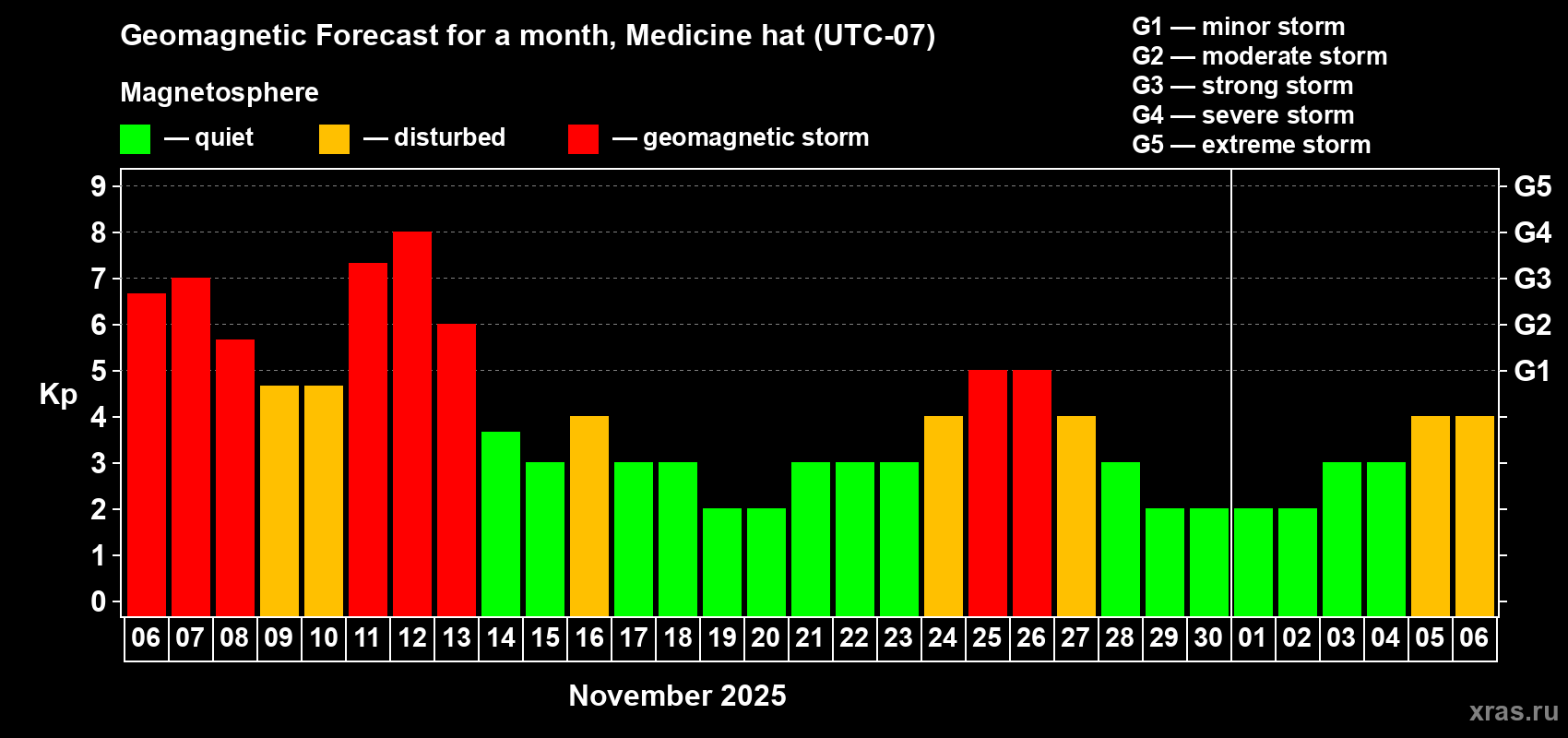 Geomagnetic storm forecast in Medicine hat for Nov 06, 2025