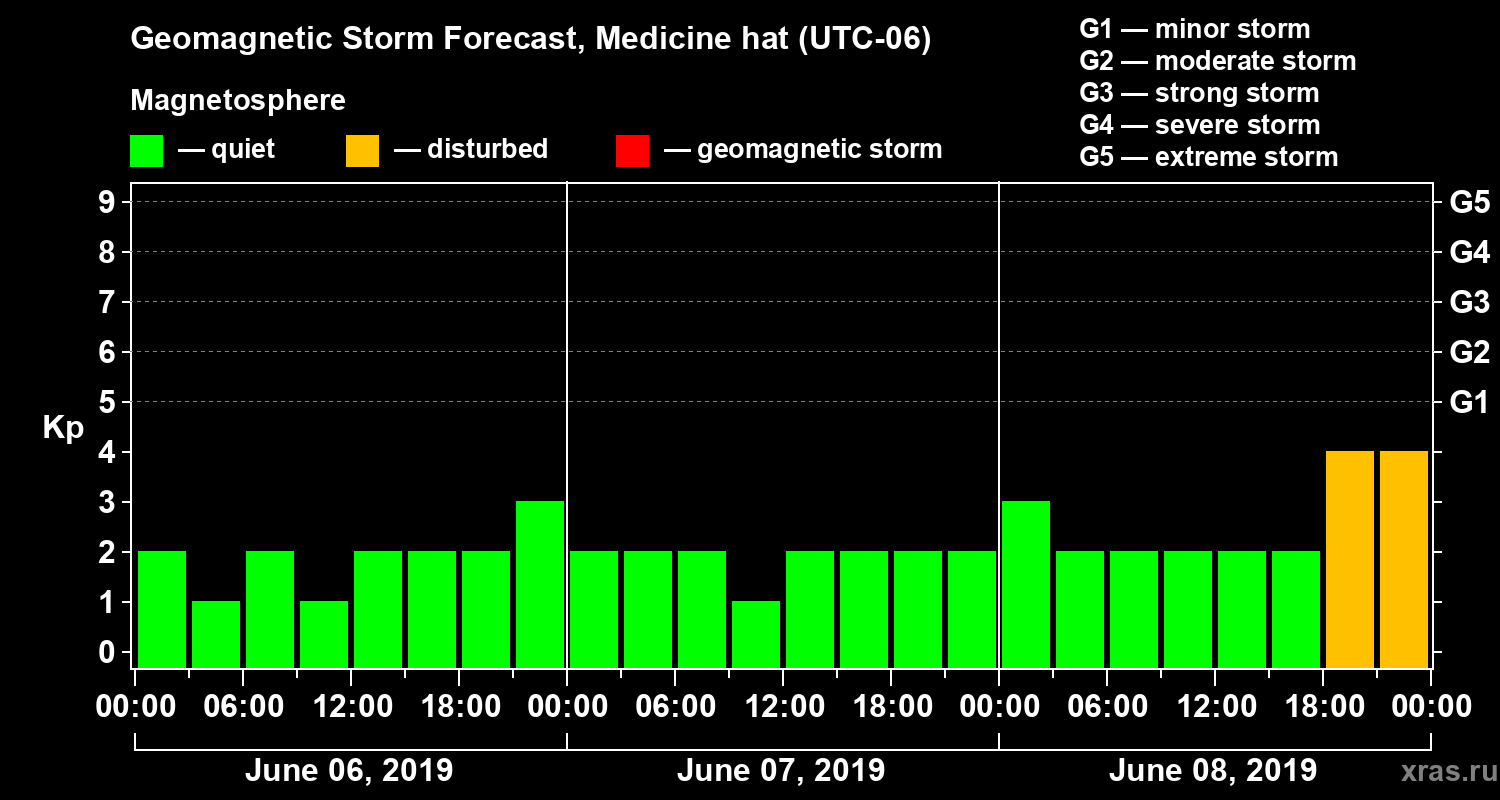 Geomagnetic storm forecast in Medicine hat for Jun 06, 2019
