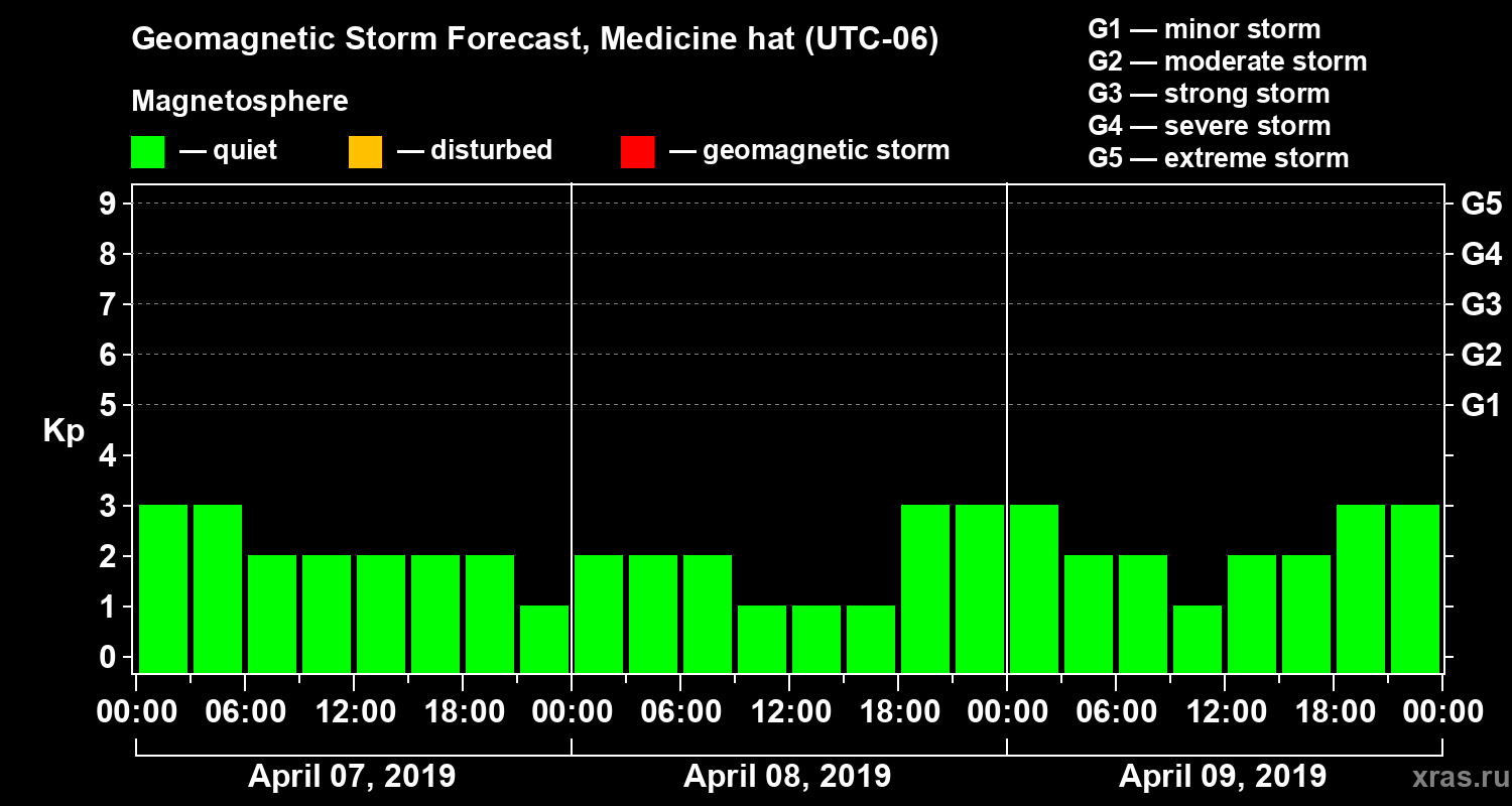 Geomagnetic storm forecast in Medicine hat for Apr 07, 2019