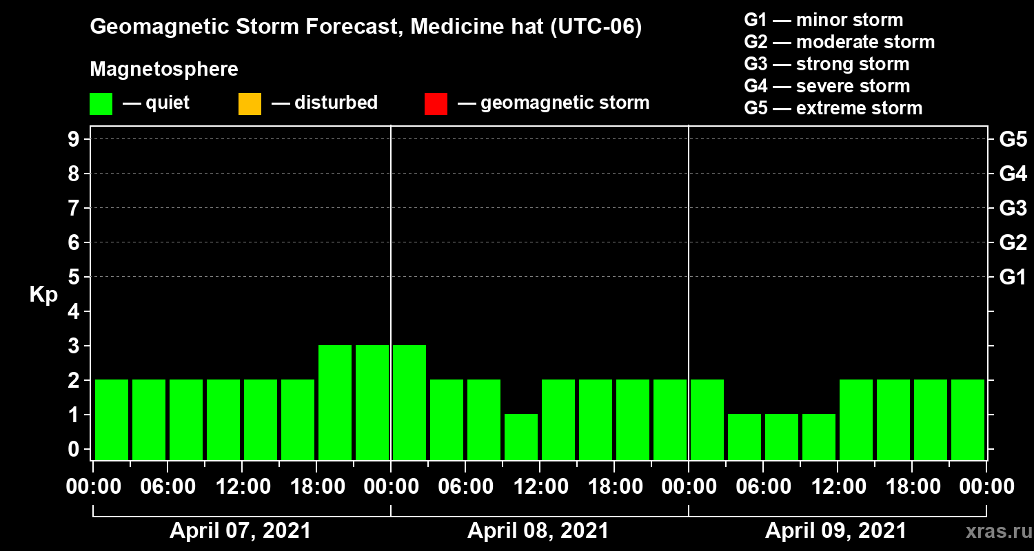 Geomagnetic storm forecast in Medicine hat for Apr 07, 2021