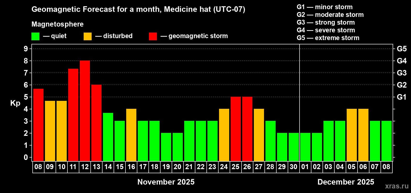 Geomagnetic storm forecast in Medicine hat for Nov 08, 2025