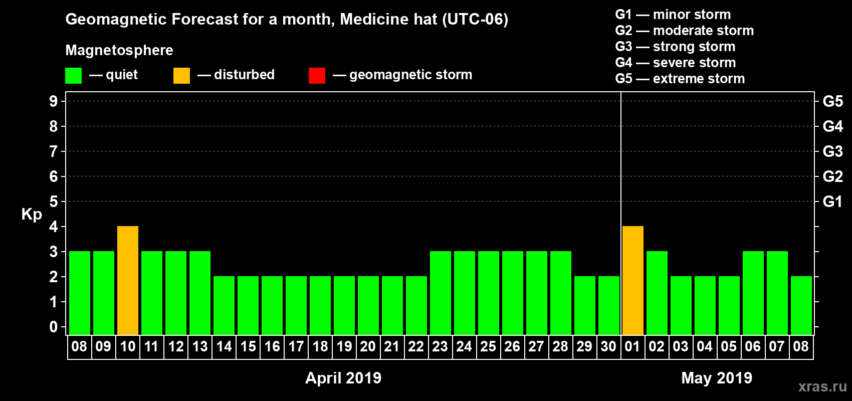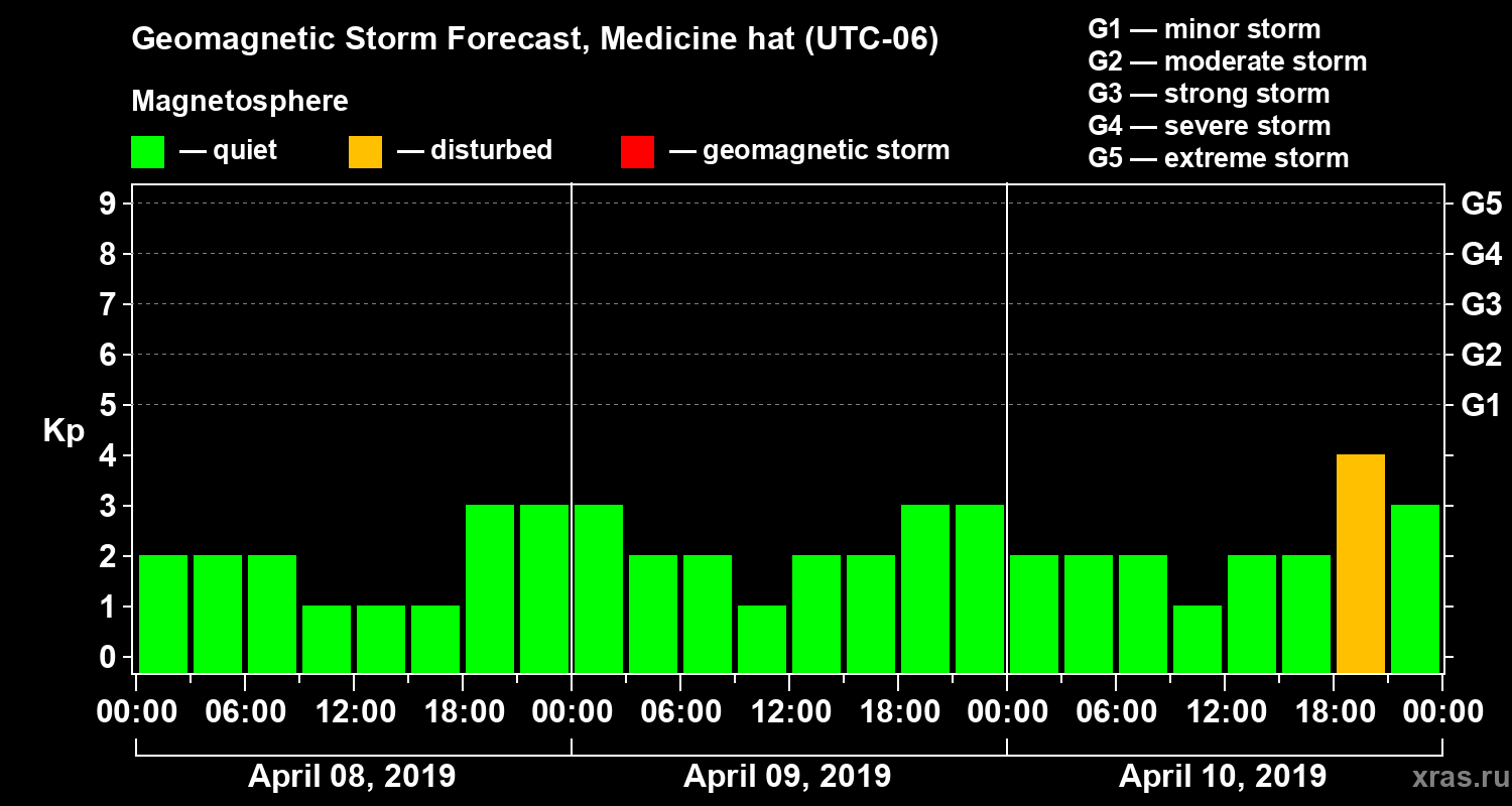 Geomagnetic storm forecast in Medicine hat for Apr 08, 2019
