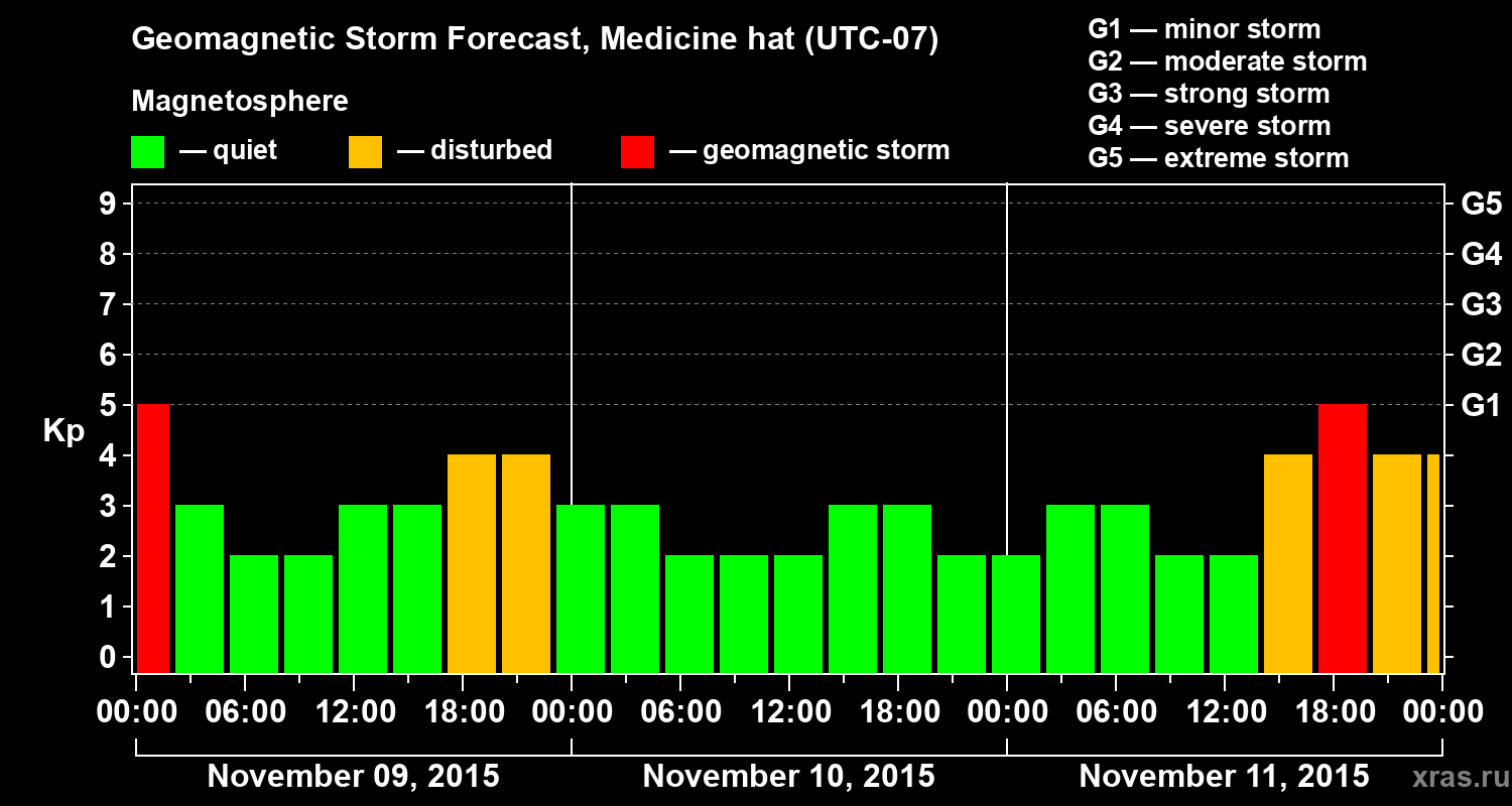 Geomagnetic storm forecast in Medicine hat for Nov 09, 2015