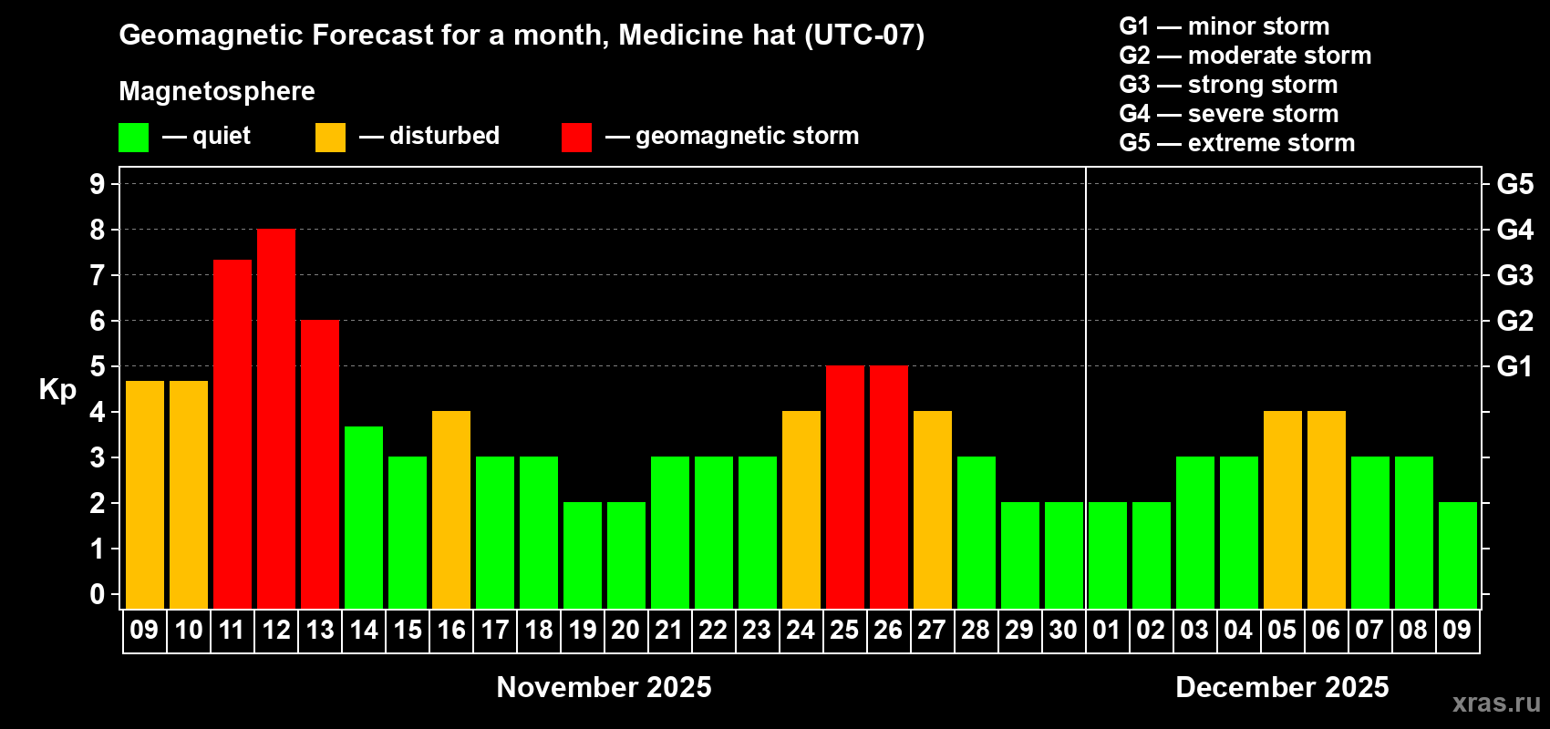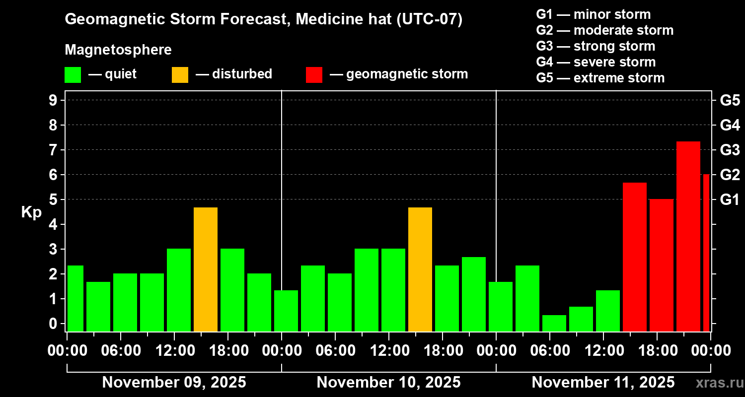 Geomagnetic storm forecast in Medicine hat for Nov 09, 2025