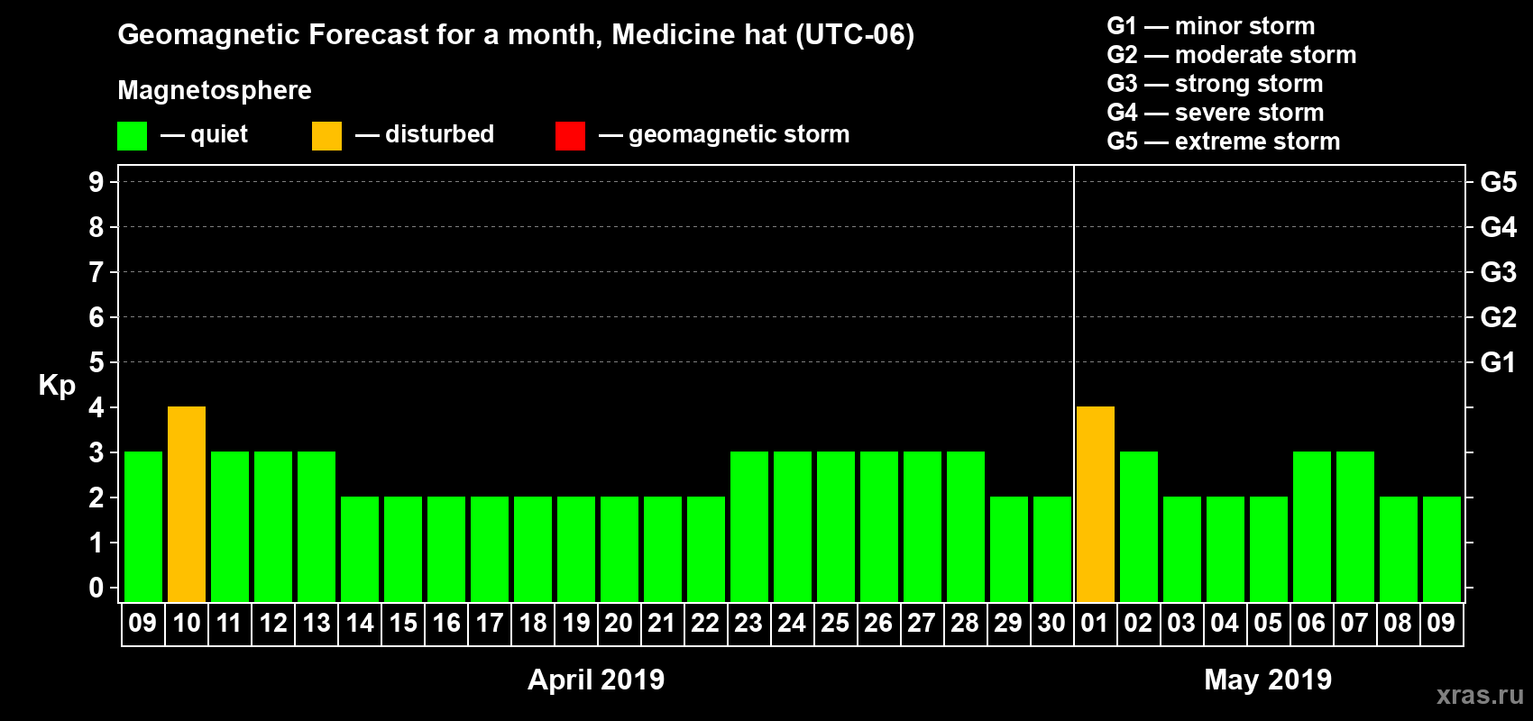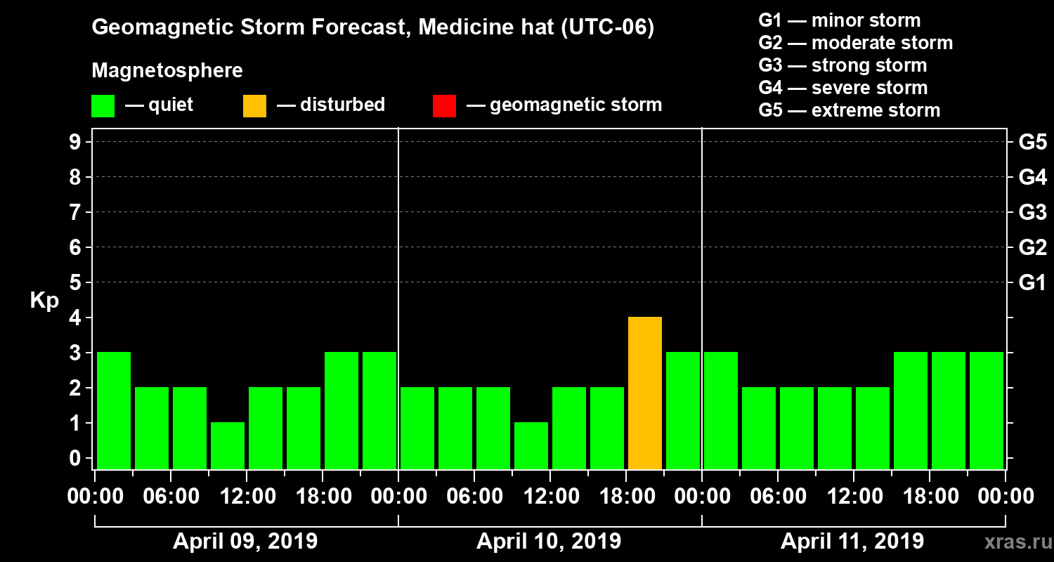 Geomagnetic storm forecast in Medicine hat for Apr 09, 2019
