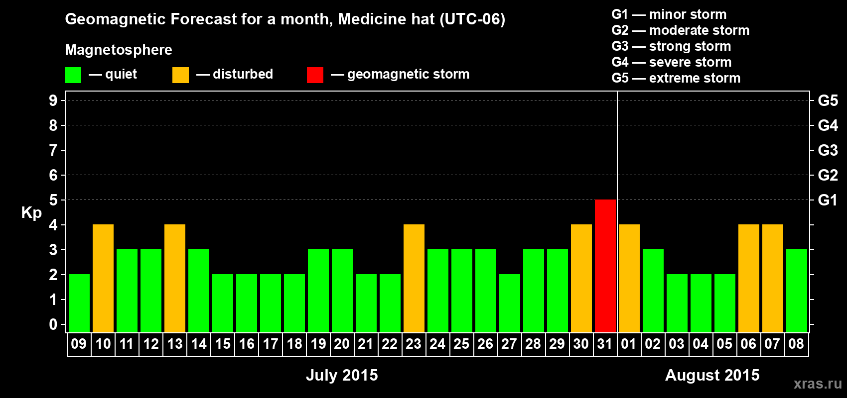 Geomagnetic storm forecast in Medicine hat for Jul 09, 2015