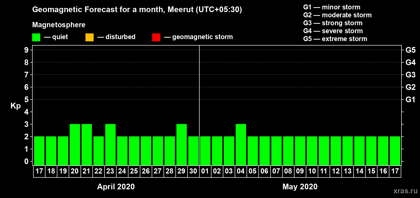 Geomagnetic storm forecast in Meerut for Apr 17, 2020