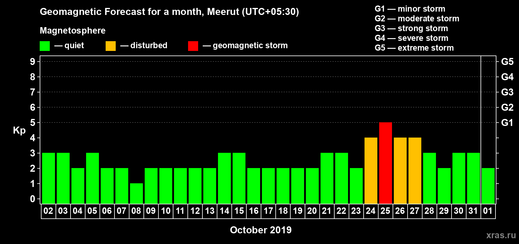 Geomagnetic storm forecast in Meerut for Oct 02, 2019
