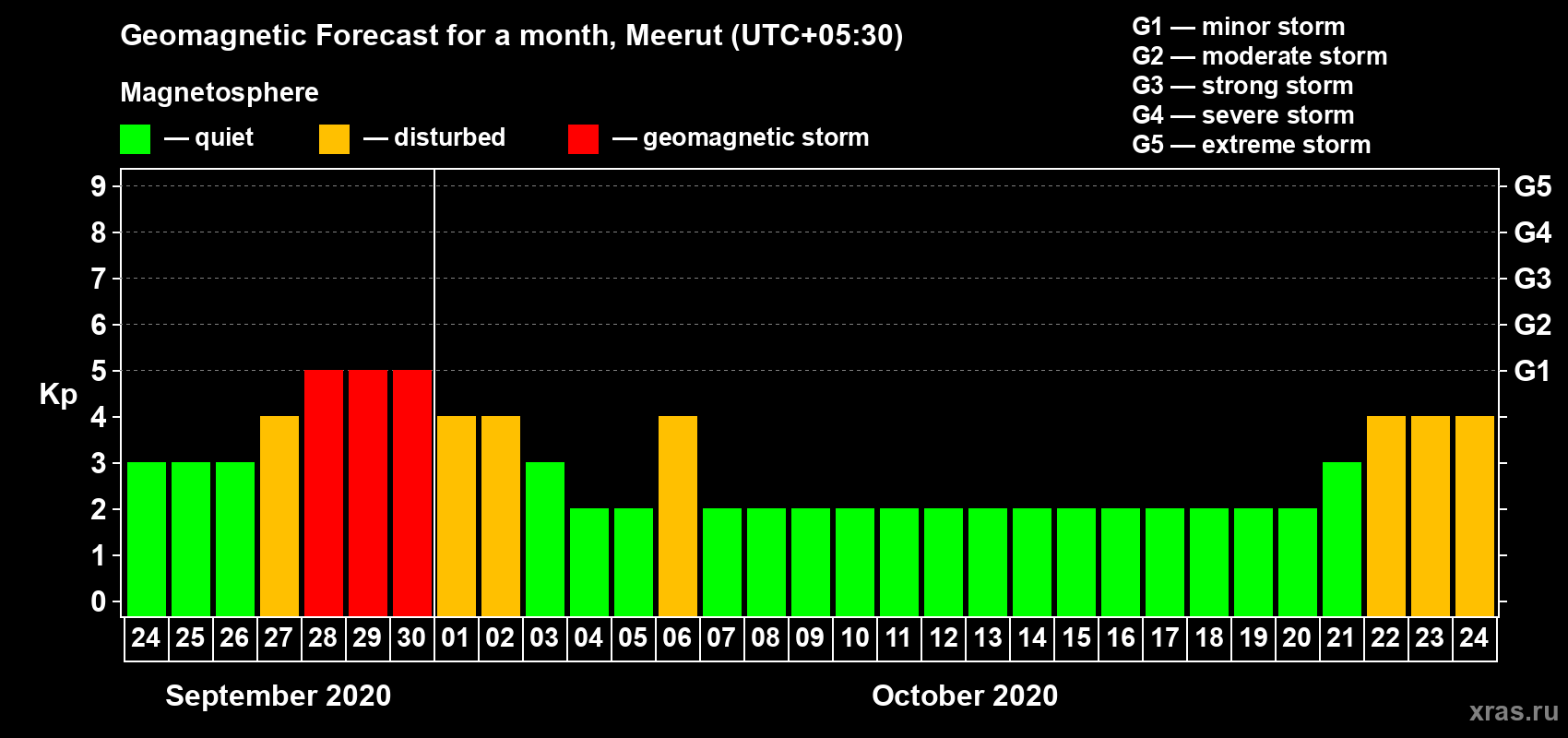 Geomagnetic storm forecast in Meerut for Sep 24, 2020