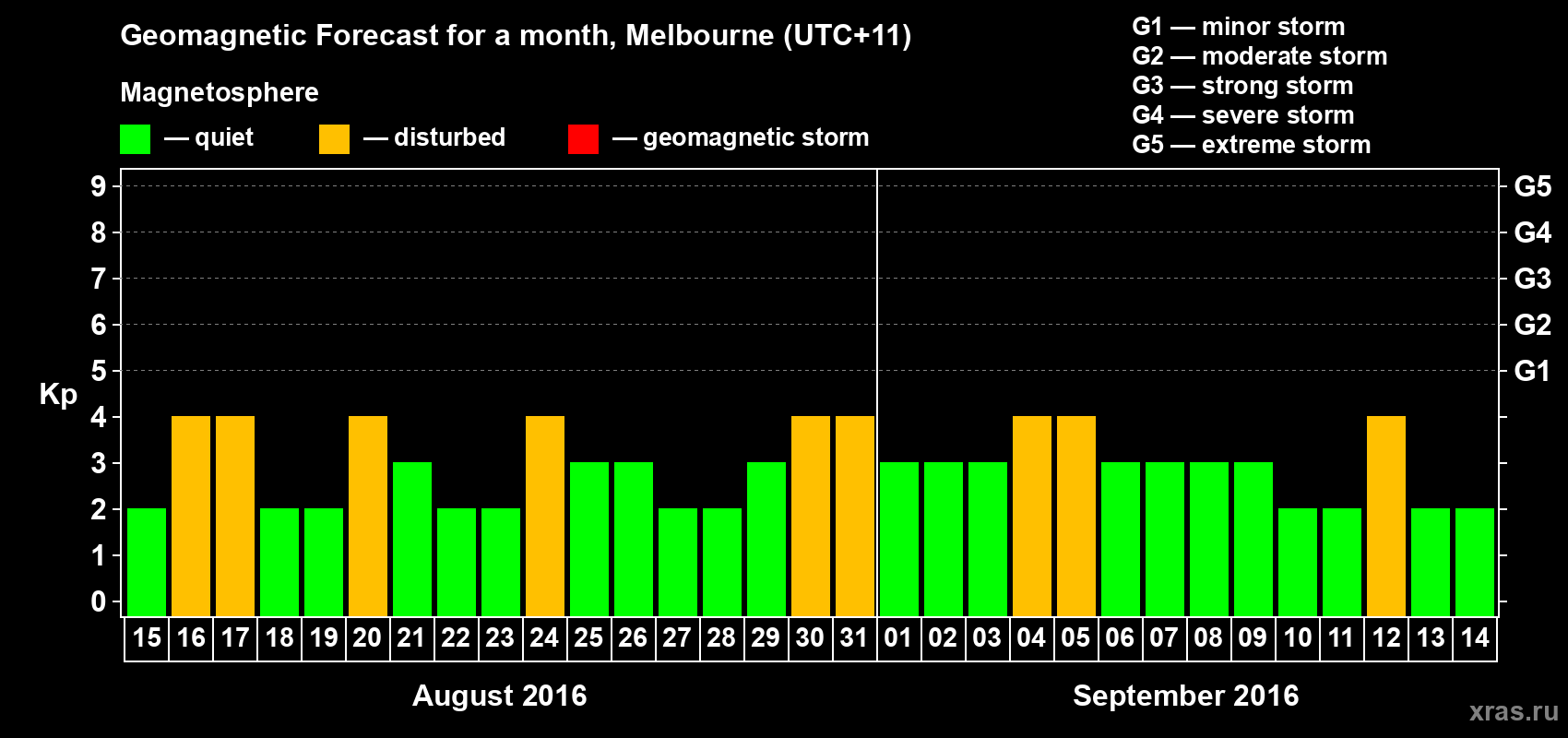 Geomagnetic activity forecast in Melbourne — Aug 15, 2016