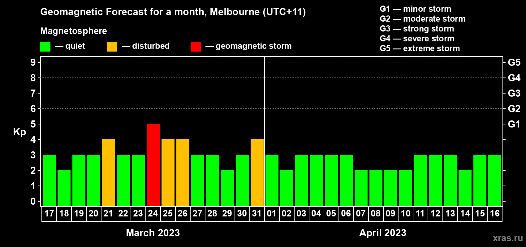 Geomagnetic activity forecast in Melbourne — Mar 17, 2023