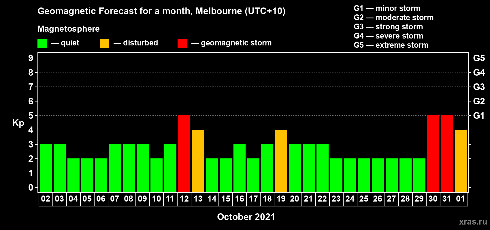Geomagnetic storm forecast in Melbourne for Oct 02, 2021