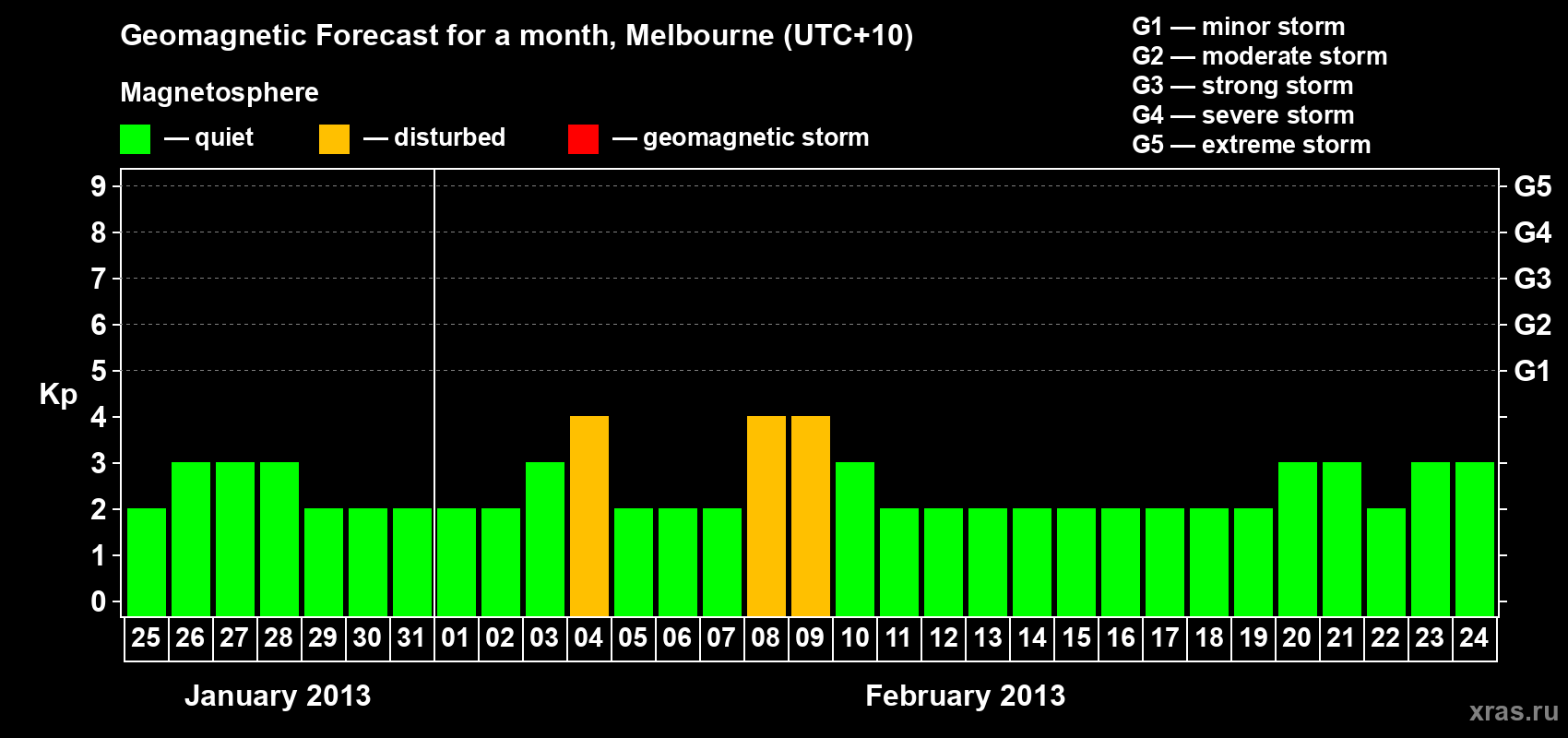 Geomagnetic storm forecast in Melbourne for Jan 25, 2013