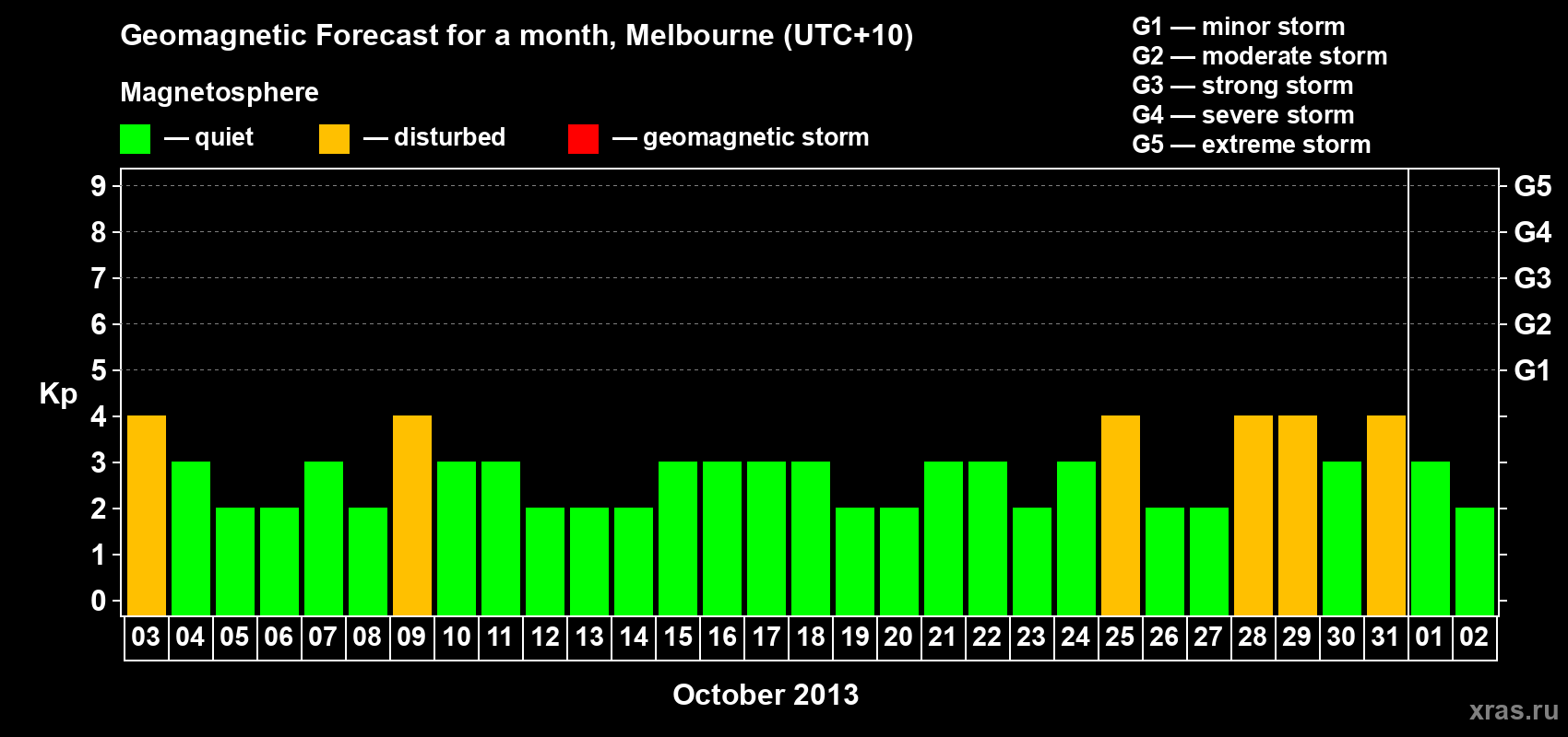 Geomagnetic storm forecast in Melbourne for Oct 03, 2013