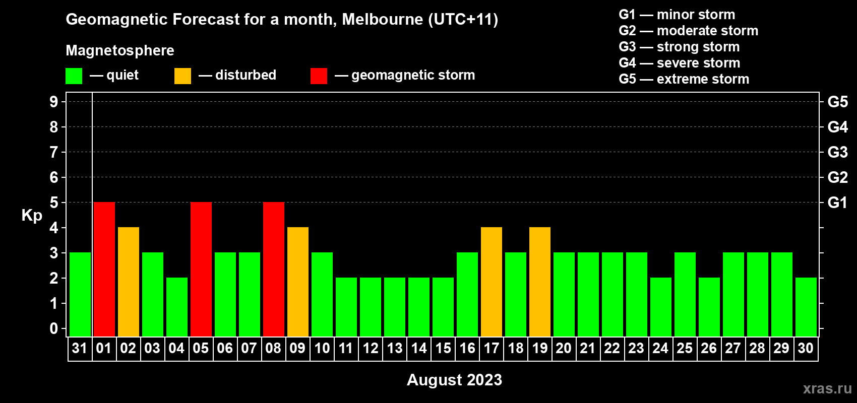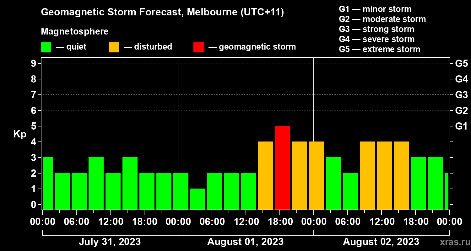 Geomagnetic storm forecast in Melbourne for Jul 31, 2023