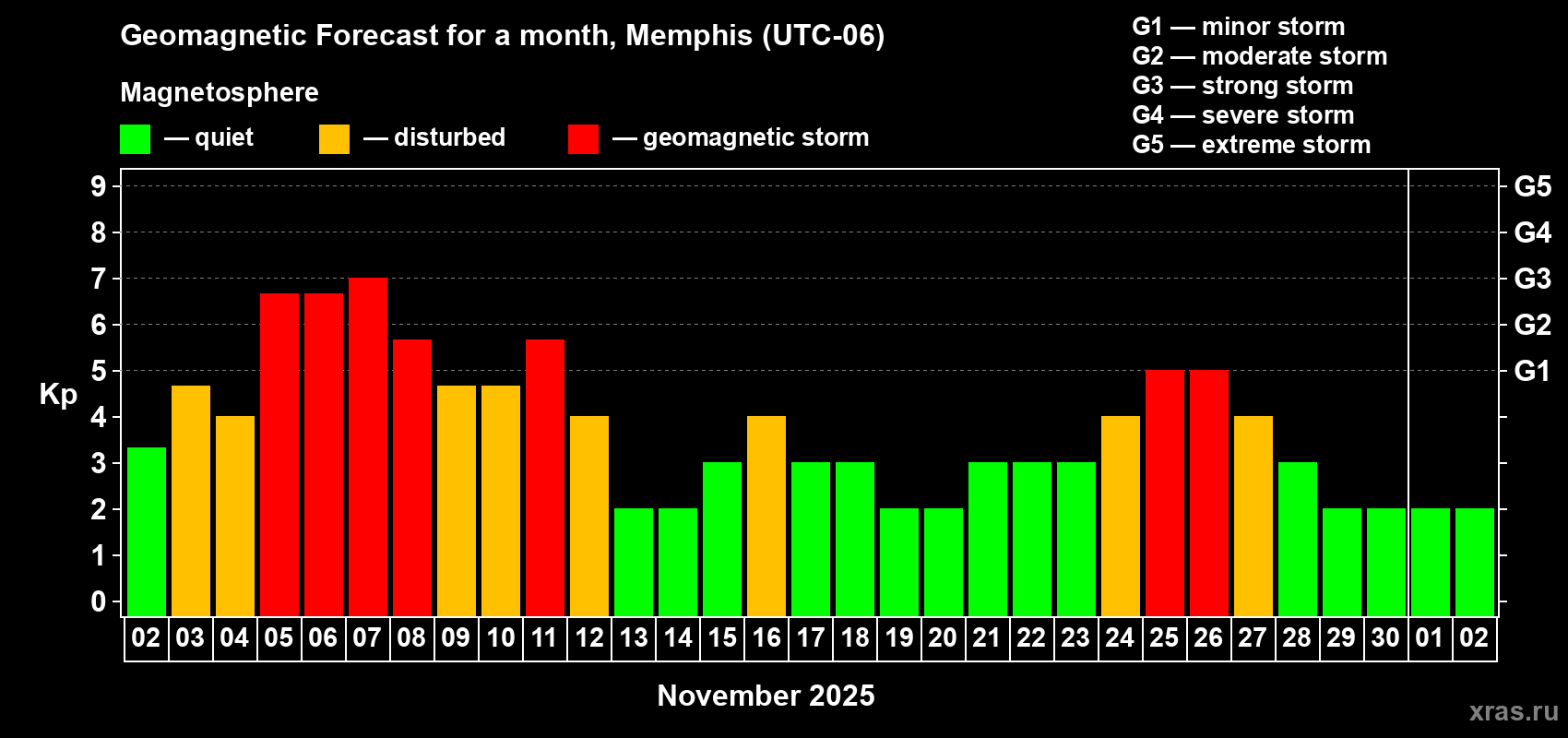 Geomagnetic storm forecast in Memphis for Nov 02, 2025