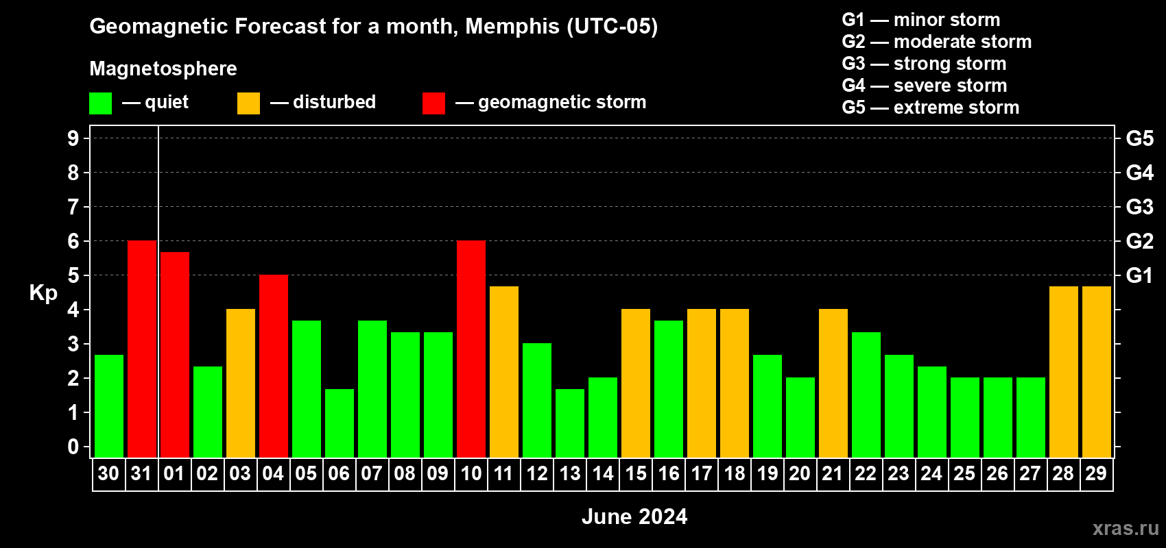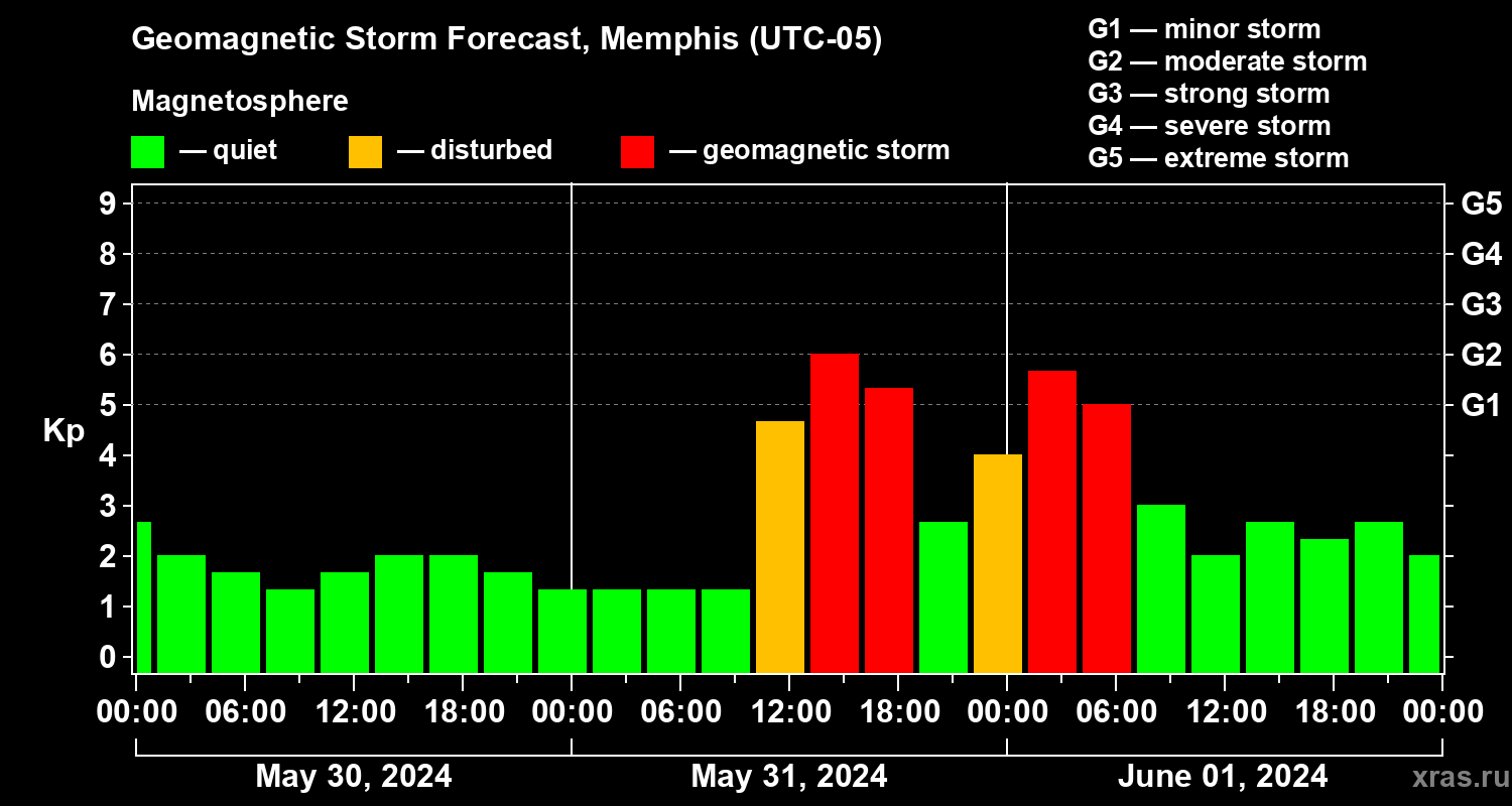 Geomagnetic storm forecast in Memphis for May 30, 2024