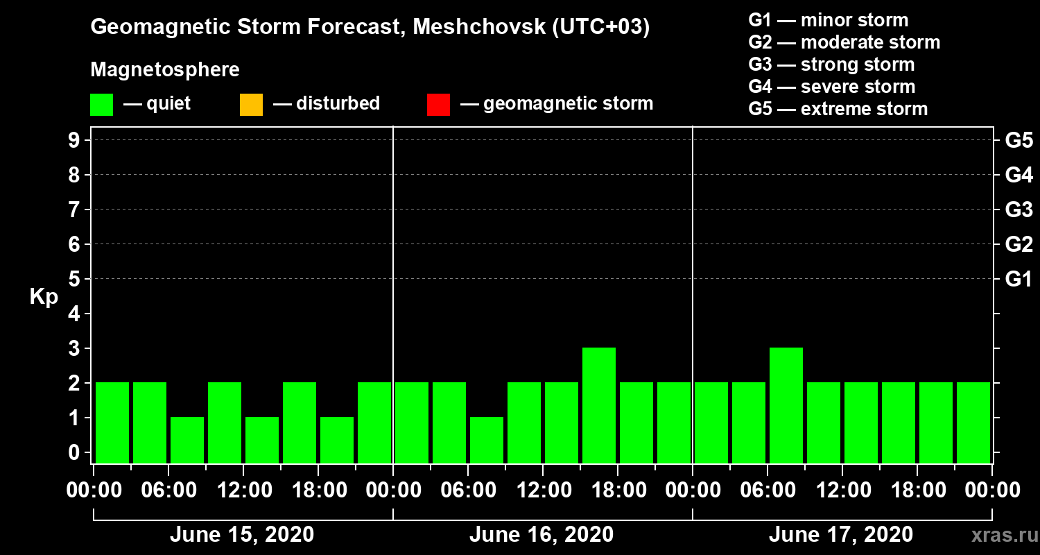 Geomagnetic storm forecast in Meshchovsk for Jun 15, 2020