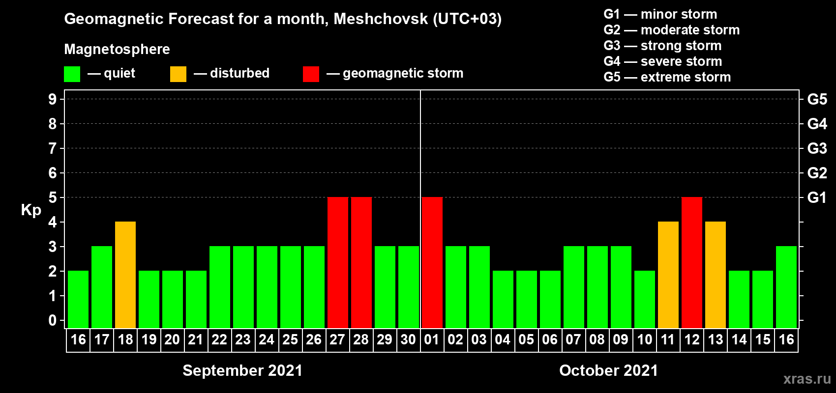 Geomagnetic storm forecast in Meshchovsk for Sep 16, 2021