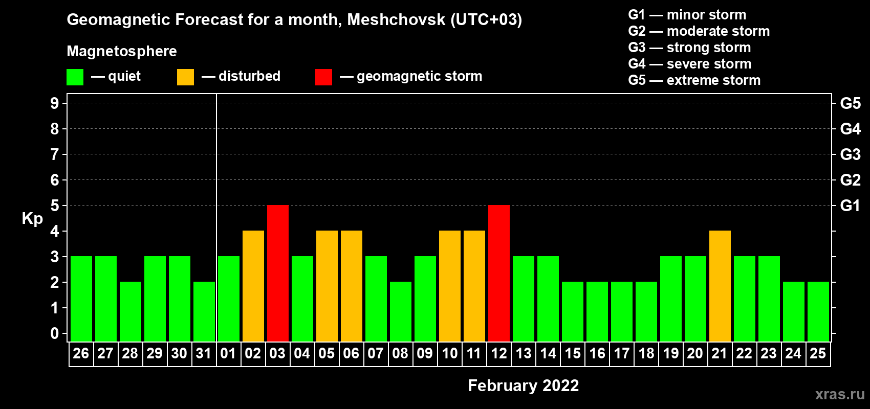 Geomagnetic storm forecast in Meshchovsk for Jan 26, 2022