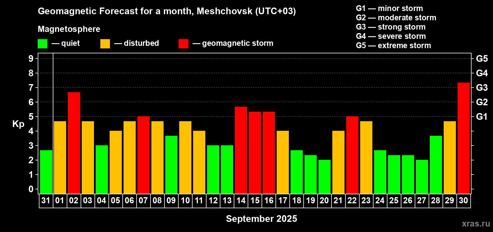 Geomagnetic storm forecast in Meshchovsk for Aug 31, 2025
